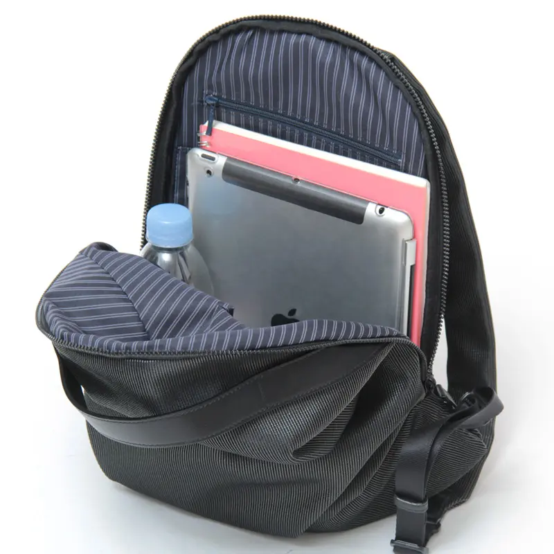 ダブルファスナーで左右どちらからもスムーズに開閉。大きく開くため、バッグの中身が一目瞭然です。B5サイズ対応で日常使いに最適な収納量。背中側にはクッション付きの背板があるため、タブレットなどのデジタルガジェットも安心して持ち運べます。