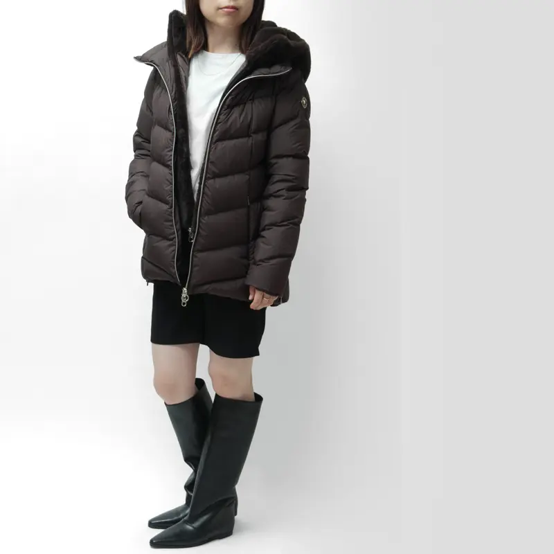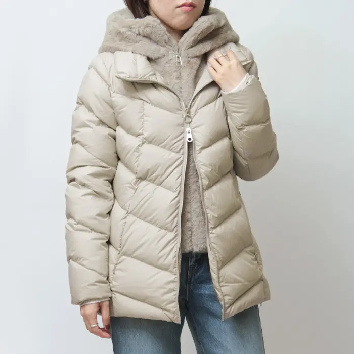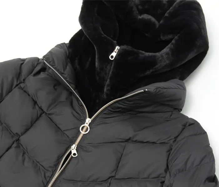 首元までしっかり温かく包んでくれるラビットファータッチのエコファーは、ふわふわで肌に優しい触り心地です。開閉はダブルファスナー式で、逆開きが可能なため、裾を開けることで動きやすく、コーディネートのアレンジも可能です。