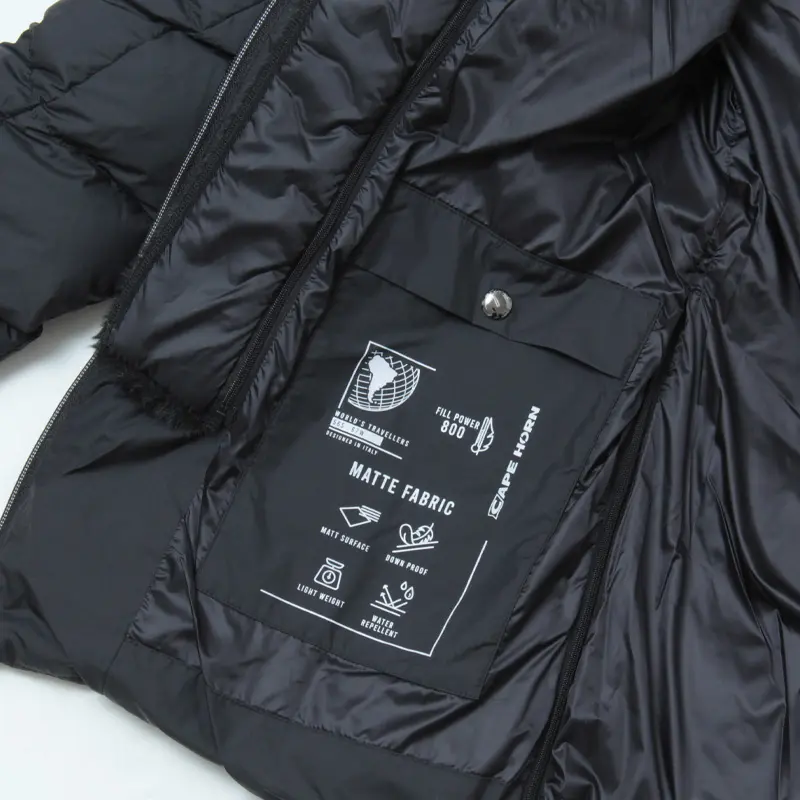 CAPE HORN(ケープホーン)で人気のミドル丈ダウン「ALVAREZ MATT(アルバレズマット)」に、日本限定カラー“BLACK EDITION”が登場。漆黒のボディにガンメタルブラックジップを配し、落ち着きのある洗練された表情に仕上げました。マットナイロンとエコファーのコンビネーションは上品かつ新鮮。ファーベストを重ねたようなエレガントなデザインで、小雨にも安心の撥水加工付き。大人の冬を彩る特別な一着です。