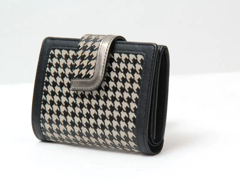 ベースは黒とベージュ(アイボリー)のシックな配色で、柄を囲むレザーや内側の黒が全体をシャープな印象に引き締めます。特に目を引くのは、留め具タブの光沢あるレザー。このモダンなアクセントが、クラシカルな千鳥格子柄に現代的な洗練さを加え、単なる定番柄ではない、ヒロコハヤシらしい個性を際立たせています。