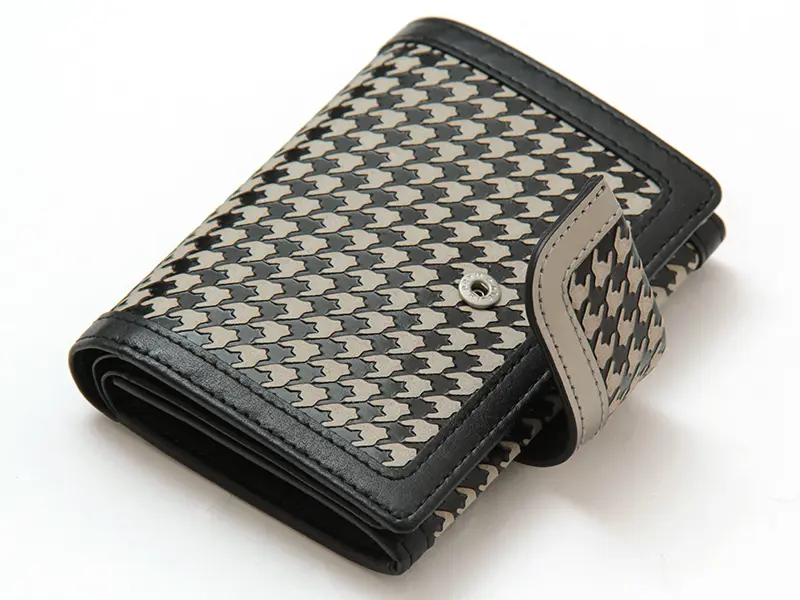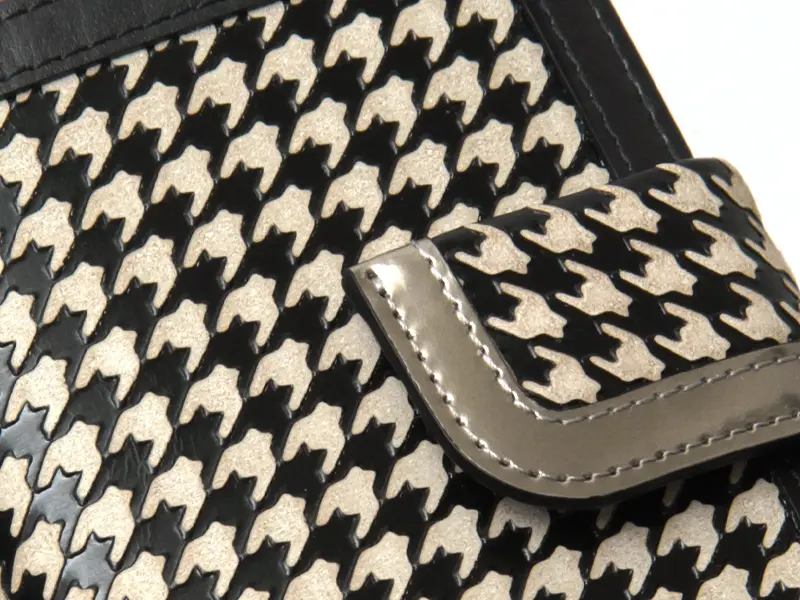 クロムなめしの牛革にクラシカルなハウンドトゥース(千鳥格子)柄を、レザーに型押しし、凸部分のみペーパーをかけて下地の色を出すことで柄を表現しています。英国・ロンドンのムードをまとった上品で飽きのこないデザインは、トレンドに左右されず、長く愛用できる逸品。大切な人への気持ちを伝えるギフトとしても最適です。