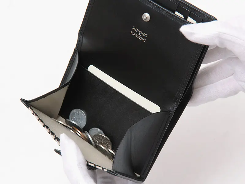 小銭入れはスナップボタン付きで、サイドにはしっかりとマチが施されています。この設計により、大きく開いてコインの出し入れをスムーズに行うことが可能です。 内側にはカード収納も完備しており、使用頻度の高いカードをスマートに携帯できます。