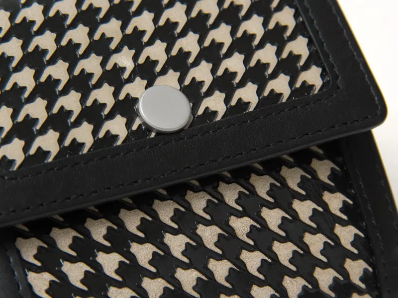 クロムなめしの牛革にクラシカルなハウンドトゥース(千鳥格子)柄を、レザーに型押しし、凸部分のみペーパーをかけて下地の色を出すことで柄を表現しています。英国・ロンドンのムードをまとった上品で飽きのこないデザインは、トレンドに左右されず、長く愛用できる逸品。大切な人への気持ちを伝えるギフトとしても最適です。