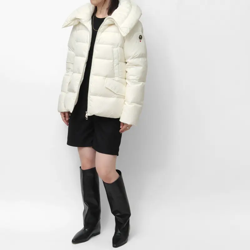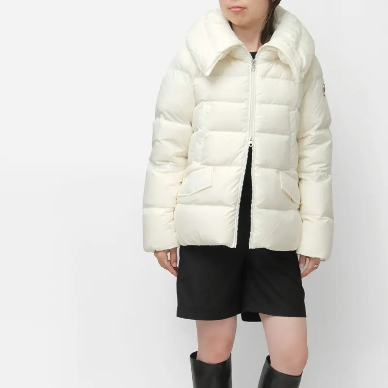 立体的な襟がアクセントのショートダウン。襟の後ろにドローコードが付いており、絞ることで立体感が際立ちます。
