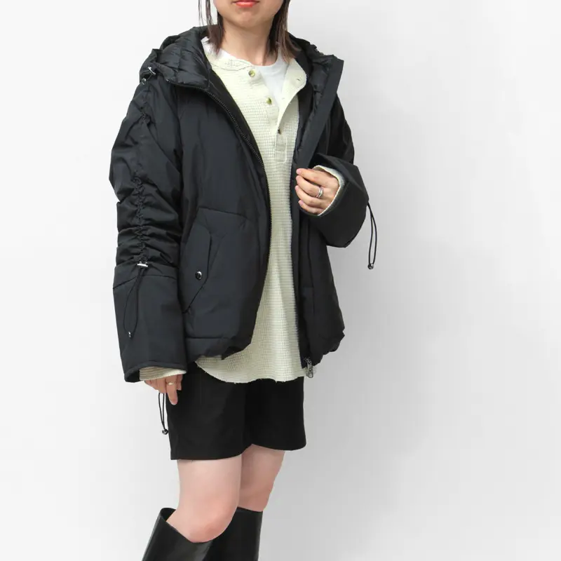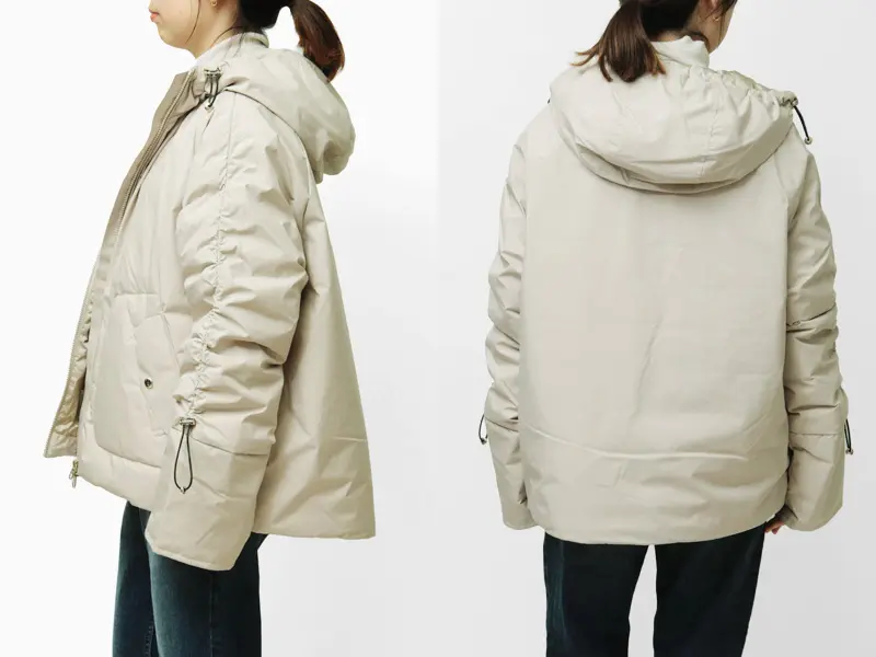 袖や裾のドローコードを絞ったり、フード周りのコードを絞ることで、シルエットの変化も楽しめるので、さまざまなボトムスと相性抜群。