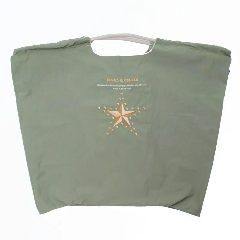 モスグレーのナイロン生地は、優しいカーキのような落ち着いたカラー。きらりと光るゴールドのスタッズのような輝きと立体感を刺繍で表現しています。シンプルながらも存在感があり、どんなコーディネートにも合わせやすい大人可愛いエコバッグです。