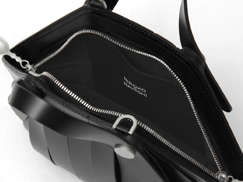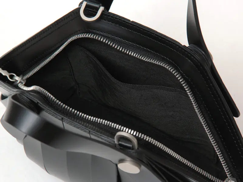 開閉はダブルファスナー仕様。下まで大きく開くファスナーで、中身が見やすく落ちにくいスマートな設計。内袋をベルトで包んだ特徴的な構造により、入れる物でフォルムが変化します。