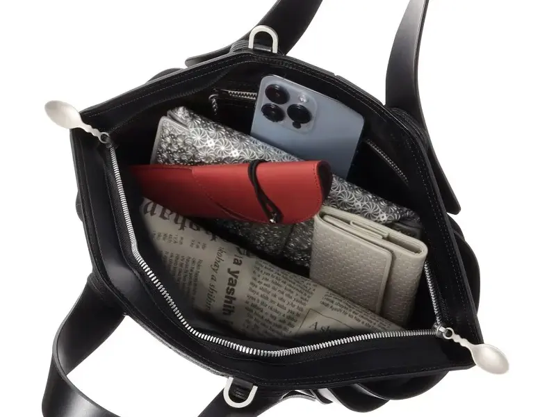 開閉はダブルファスナー仕様。下まで大きく開くファスナーで、中身が見やすく落ちにくいスマートな設計。内袋をベルトで包んだ特徴的な構造により、入れる物でフォルムが変化します。
