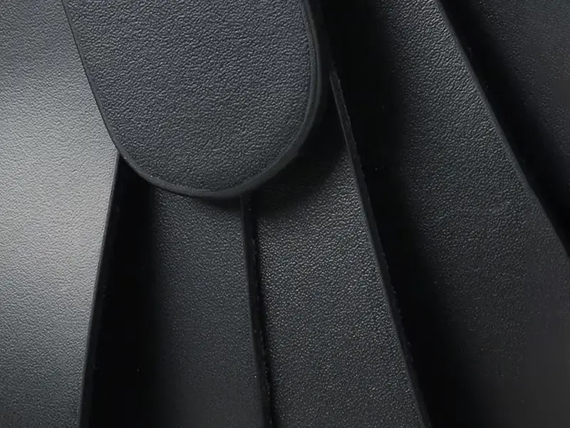 クロームなめし牛革の上品な光沢とフラットな質感が、大人の上質感を演出。レザーの縦ラインが光を受け止め、豊かな表情を生み出します。ユニークなスプーン型の引手が遊び心あるアクセント。丁寧な作り込みにより、長く愛用できる、洗練された一品です。