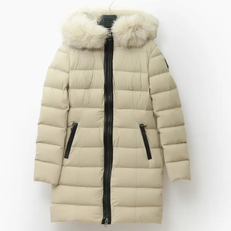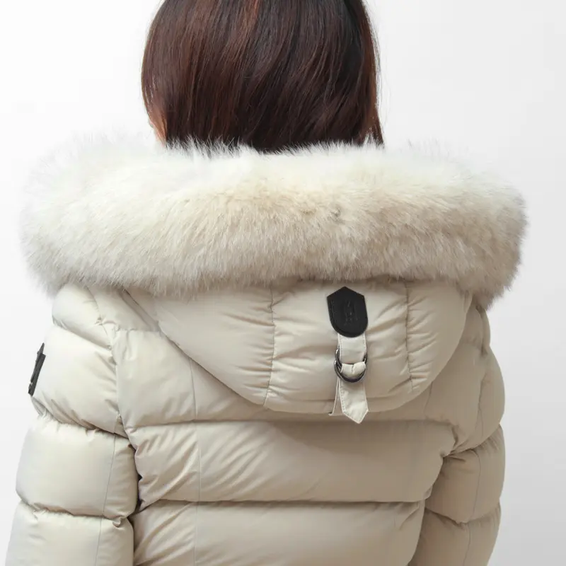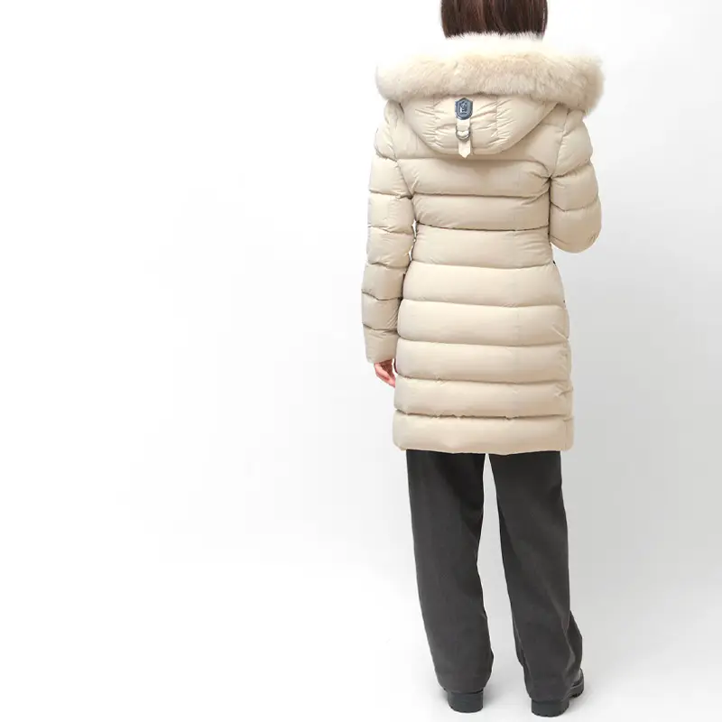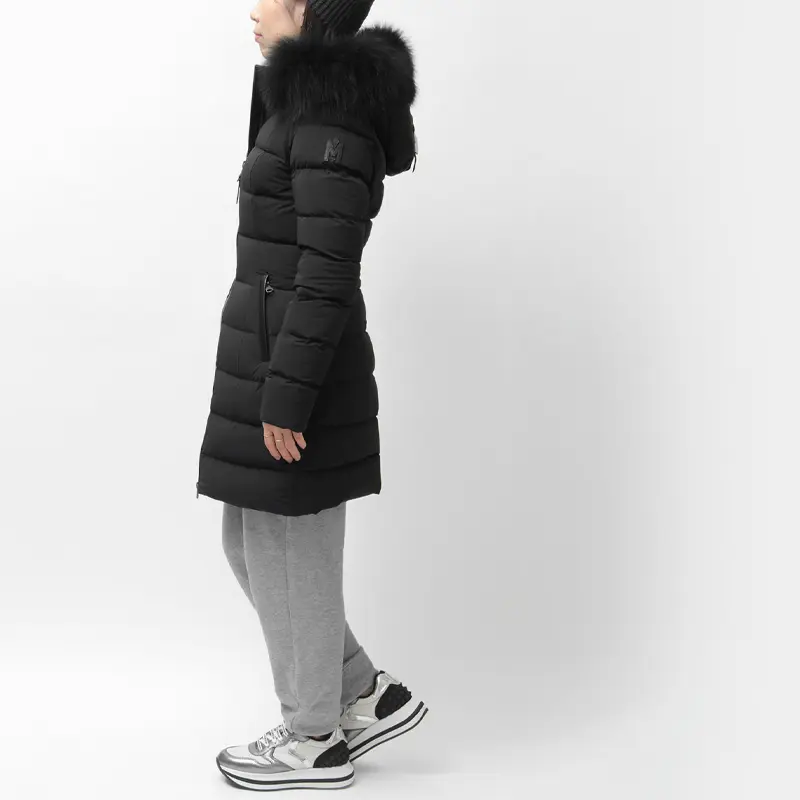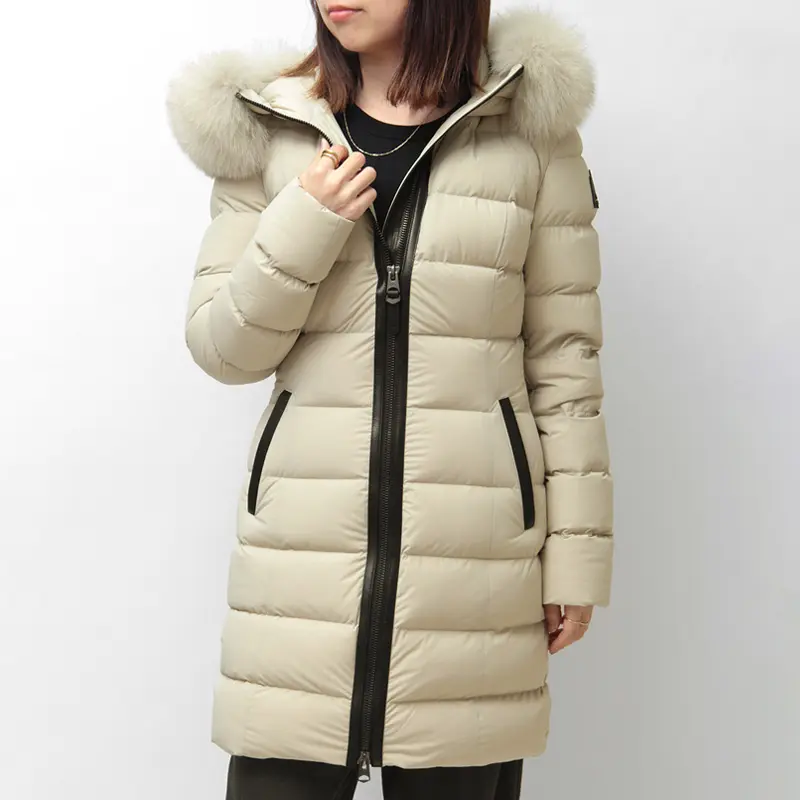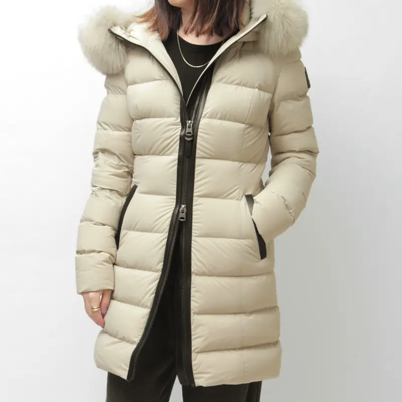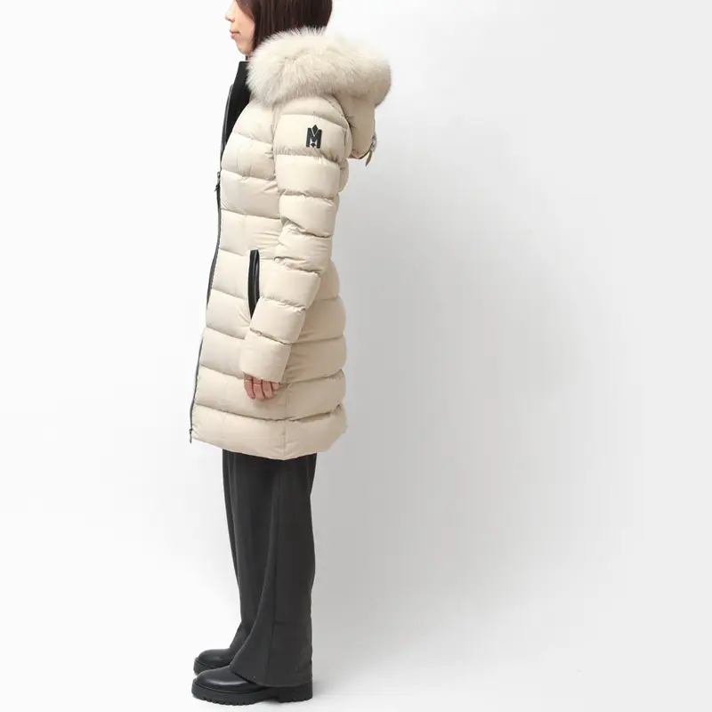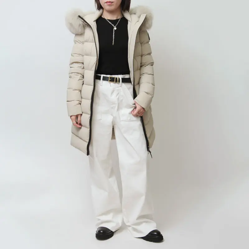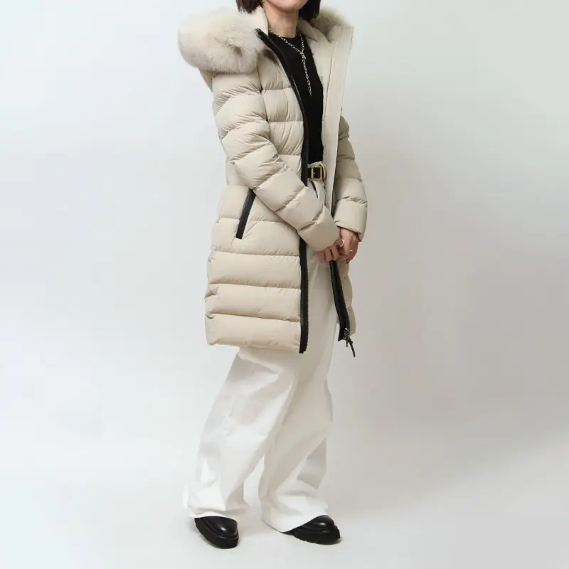 撥水性と通気性に優れたマルチウェイストレッチ素材を採用。縦横に伸縮し、細身でもストレスフリーな着心地を実現します。中綿には上質なグースダウン90%を充填し、防寒性は抜群。フードのボリューミーなフォックスファーとレザーディテールが、装いに品格と高級感を添えます。