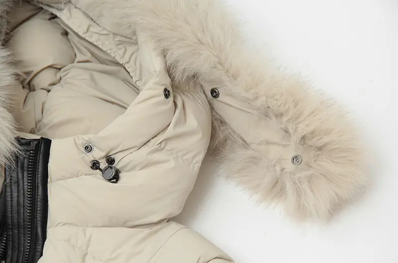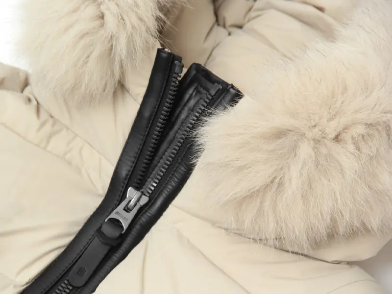 顔周りを華やかに彩る、ボリュームたっぷりのリアルファー(フォックスファーなど、素材を明記)。その上質さが、カジュアルになりがちなダウンコートに品格とラグジュアリーなムードを添えます。ファーは取り外し可能で、気分に合わせてアレンジできます。