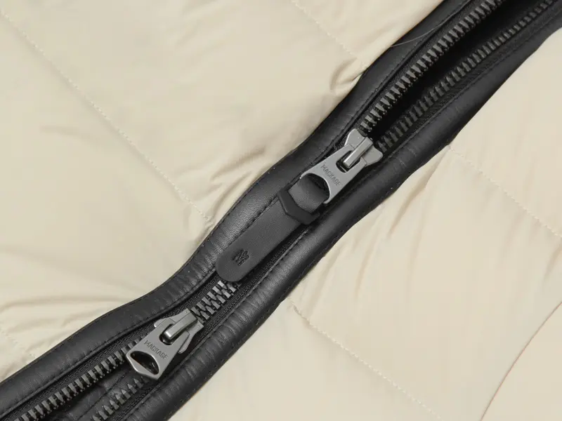 開閉はダブルファスナー式で、逆開きが可能なため、裾を開けることで動きやすく、コーディネートのアレンジも可能です。レザー使いのディテールも高級感あります。