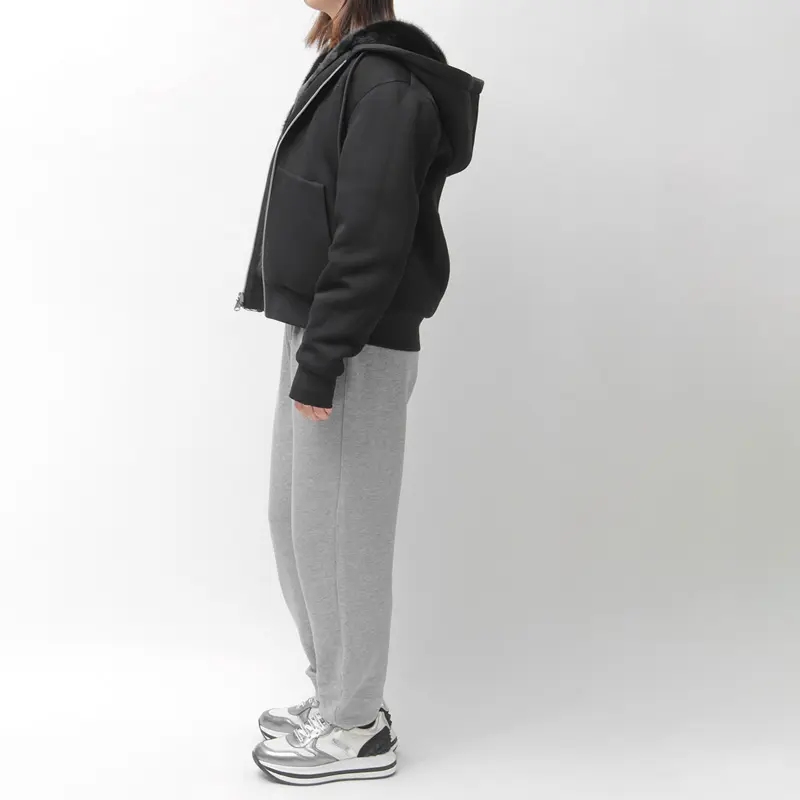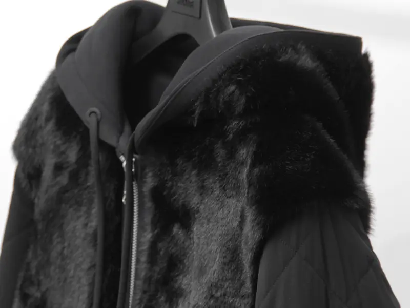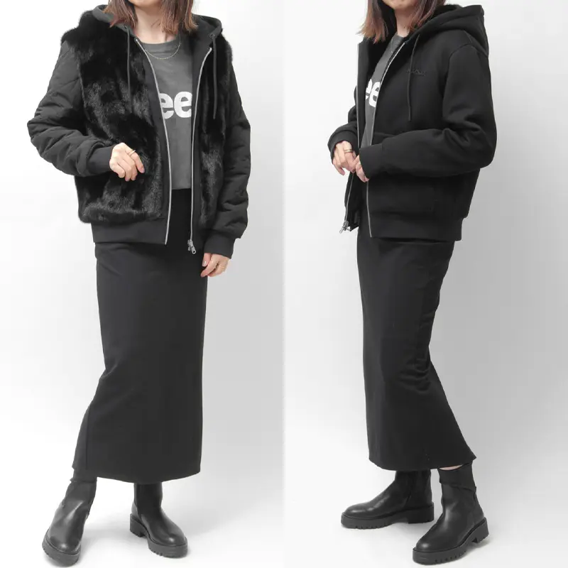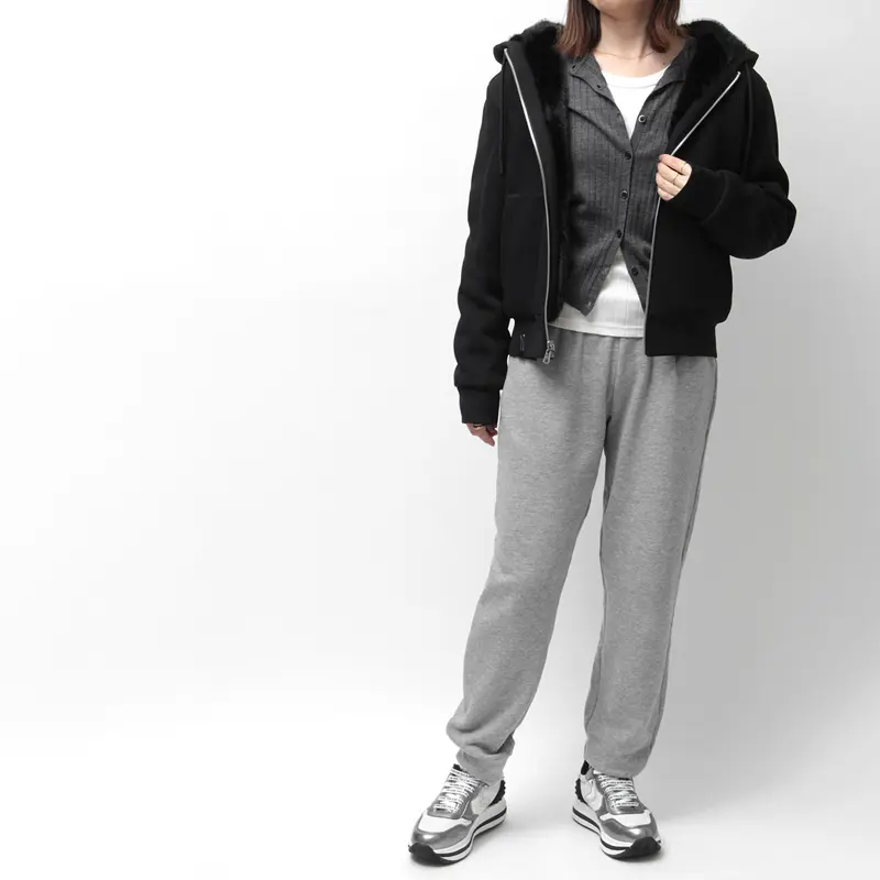 贅沢なエコファー(ポリエステル)と、上質なジャージ素材(綿・ポリエステル)のコントラストが魅力的。袖やフードに用いた布帛部分(ナイロン・ポリウレタン)は、キルティング加工とストレッチ性で動きやすさを実現。リブのポリウレタンが快適なフィット感を生み、中綿(ポリエステル)が暖かさをキープします。見た目と機能性を両立した、大人のためのハイブリッドアウターです。