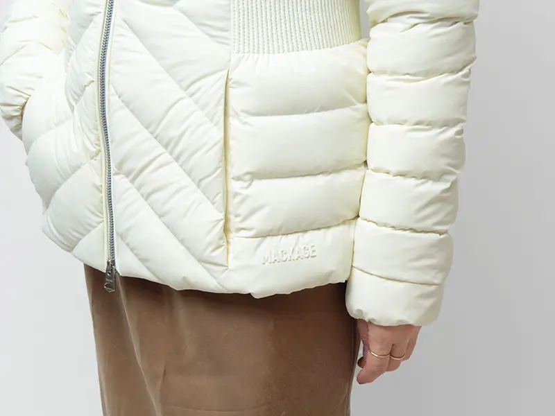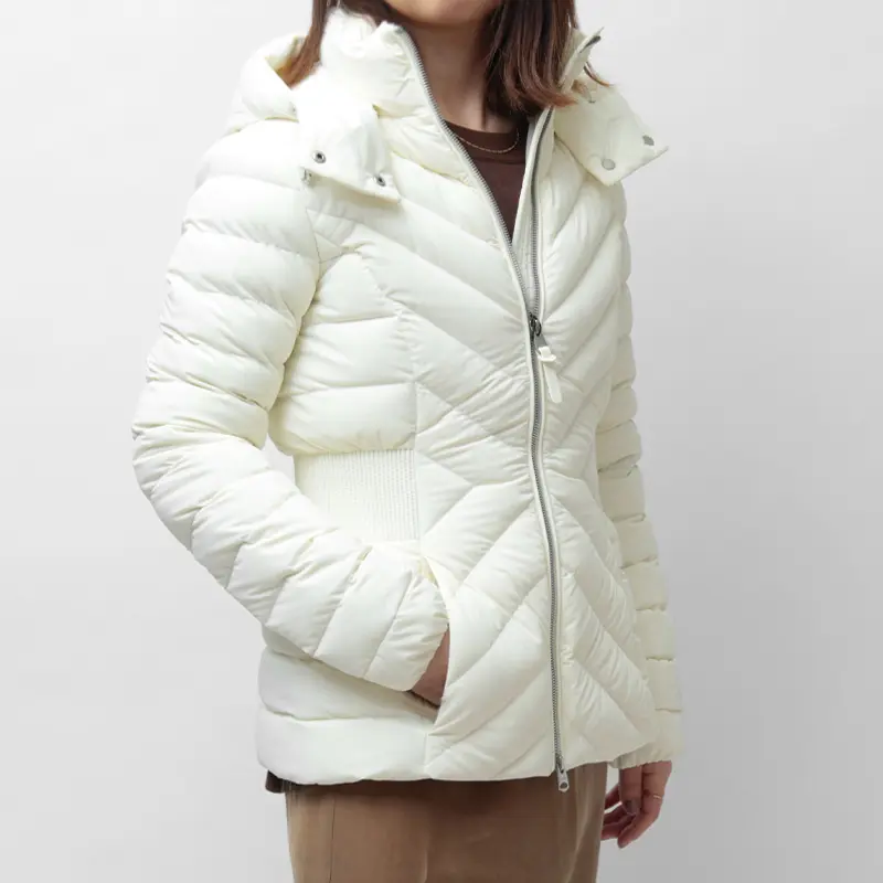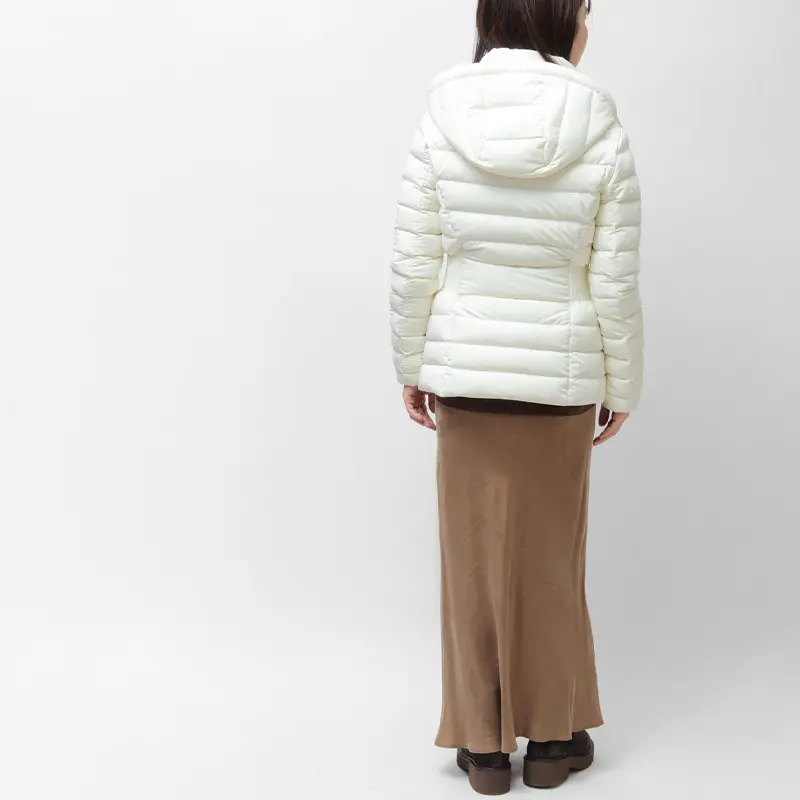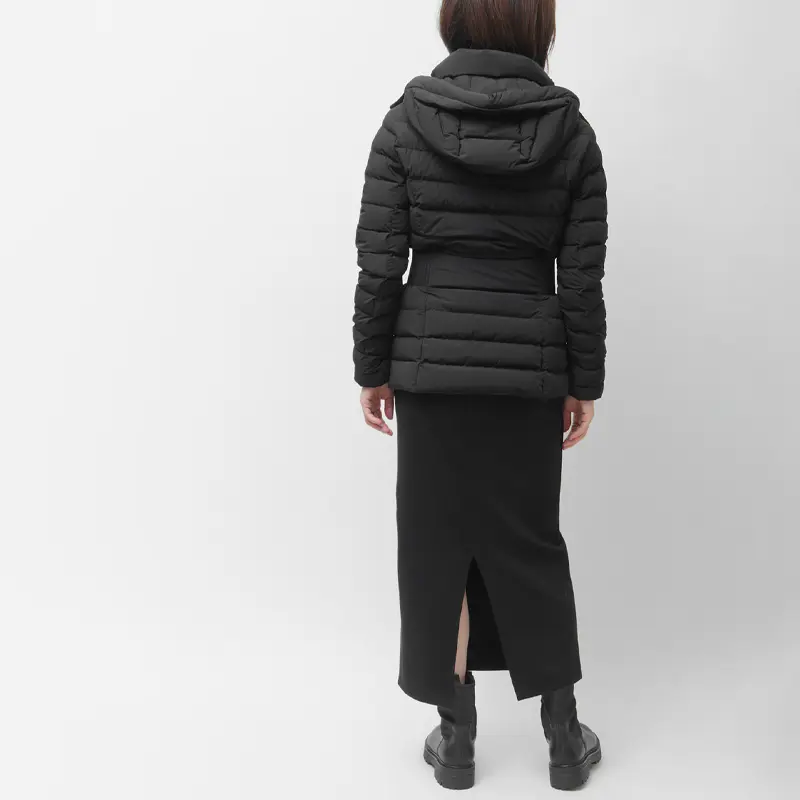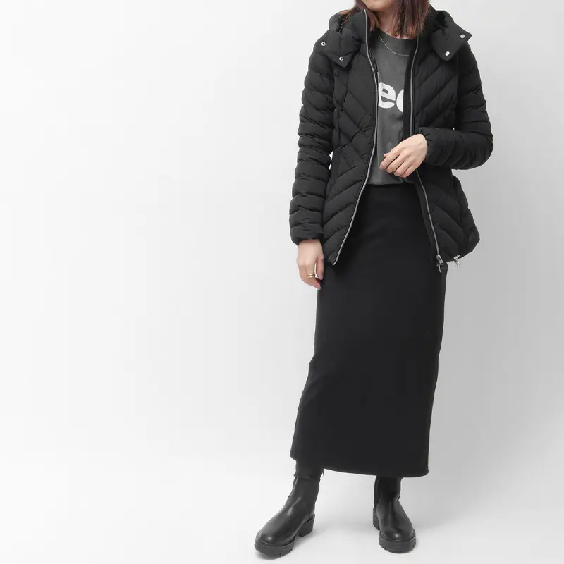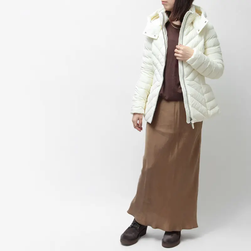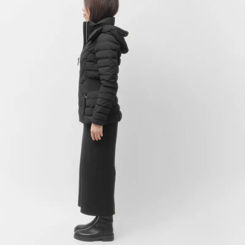 きゅっと引き締めるニットリブのウエストラインで、細見え効果と女性らしさを両立。上品な光沢感と計算し尽くされた立体的なカッティングが、ダウンのカジュアルな印象を払拭します。
