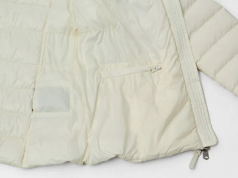 左内側にはファスナーポケットが備わっています。フードは取り外し可能で、シーンや天候に応じて着こなしをアレンジできます。フードを取り外せば、よりすっきりとしたきれいめな表情に変化します。