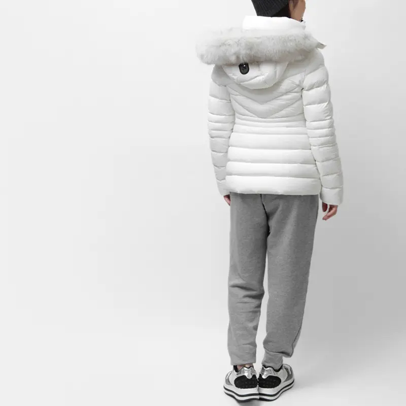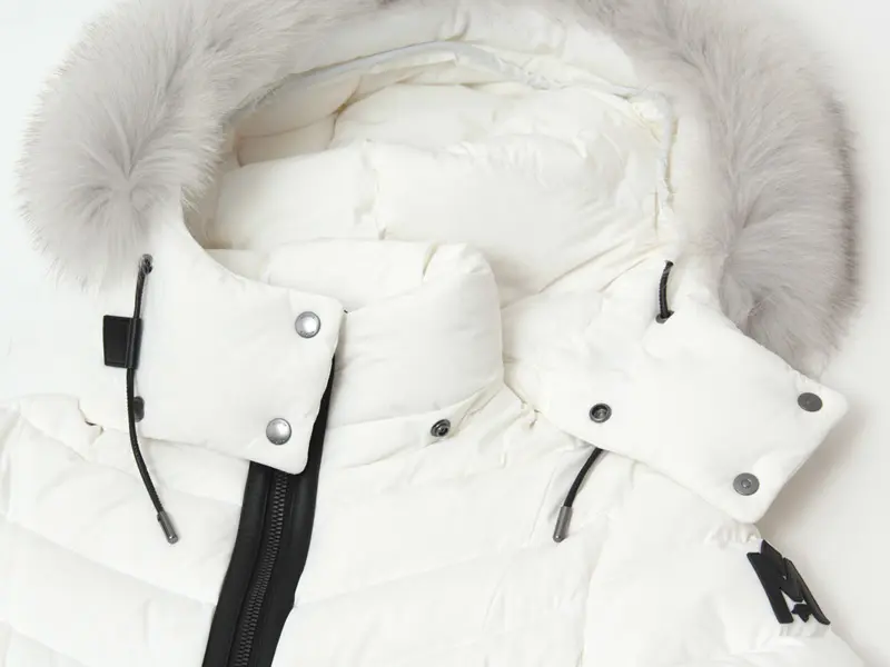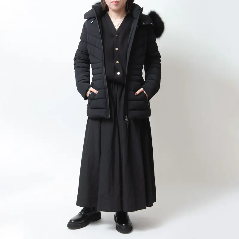 撥水性と通気性に優れたマルチウェイストレッチ素材を採用。縦横に伸縮し、細身でもストレスフリーな着心地を実現します。中綿には上質なグースダウン90%を充填し、防寒性は抜群。フードのボリューミーなフォックスファーとレザーディテールが、装いに品格と高級感を添えます。