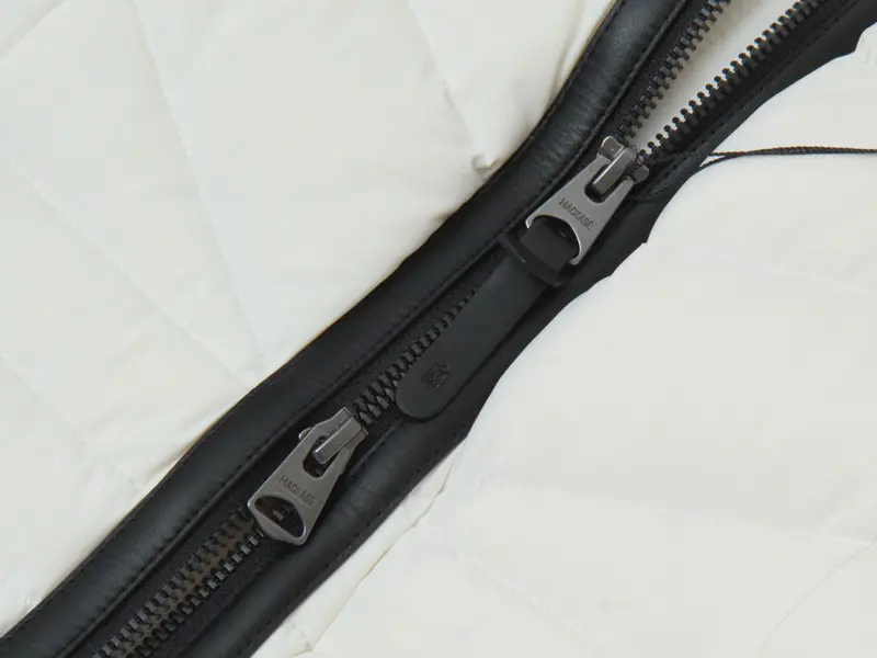 開閉はダブルファスナー式で、逆開きが可能なため、裾を開けることで動きやすく、コーディネートのアレンジも可能です。レザー使いのディテールも高級感あります。