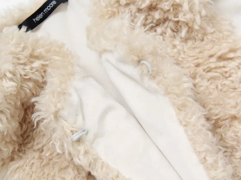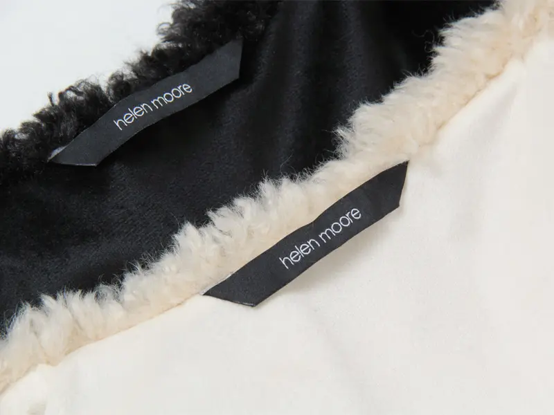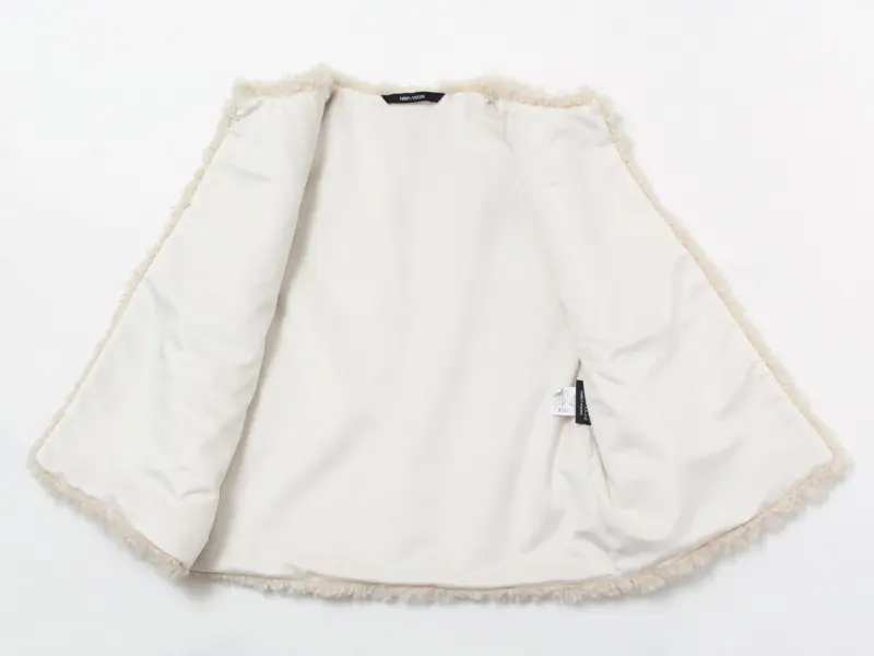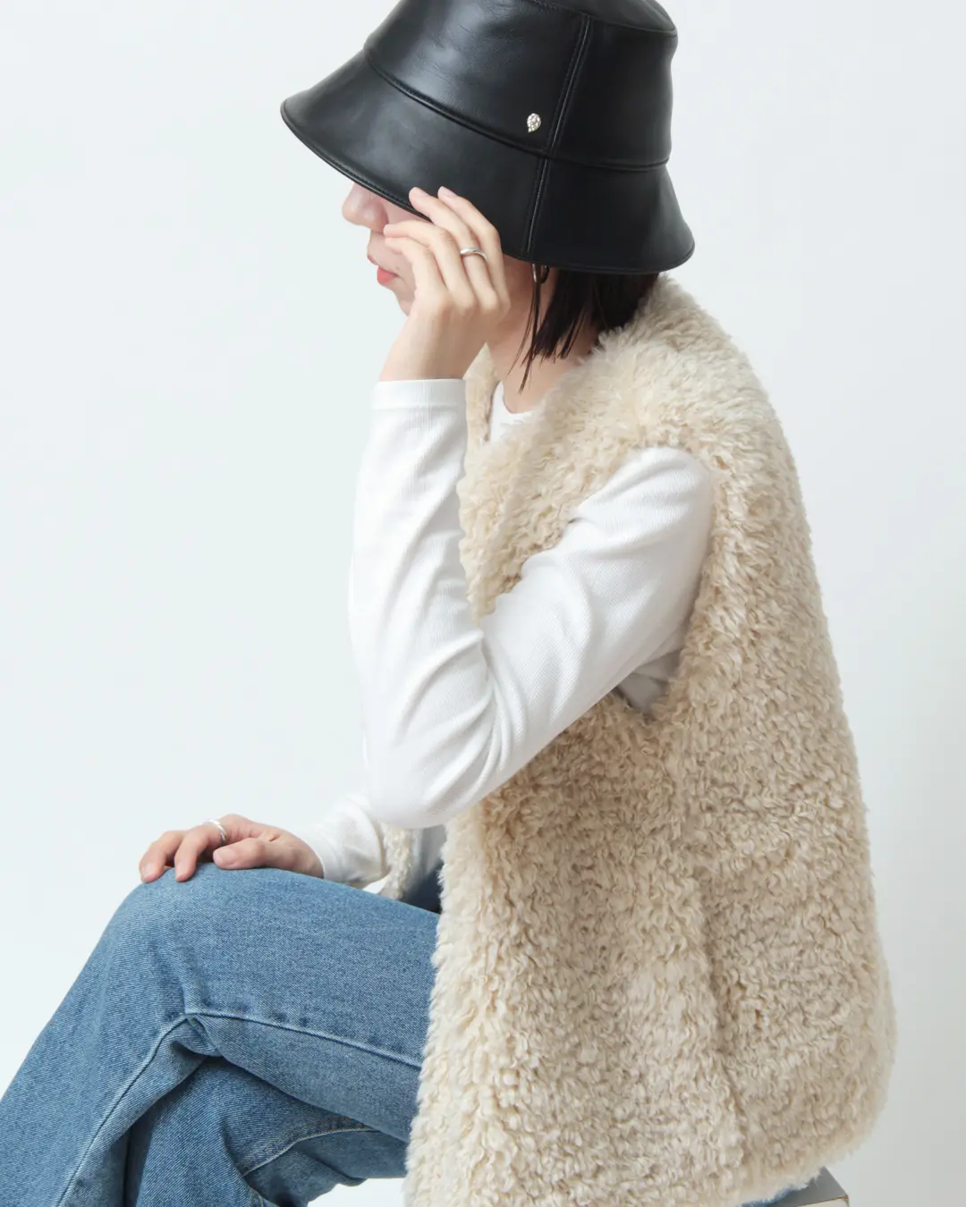 Helen Mooreのジレに使われたフェイクシープスキンは、上質な質感と軽さを兼ね備えた素材。動物性素材を使わずに、暖かく柔らかい着心地を実現。秋冬コーデのレイヤードにも馴染み、軽やかな軽アウターとして長く活躍します。