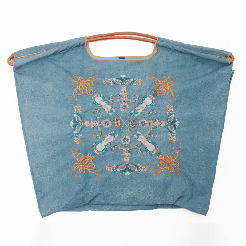 馬の顔を正面から描いた繊細なヴィクトリアン調デザインが魅力です。デニム風のナチュラルな素材感は刺繍の雰囲気と相まって、持つ人をエレガントに引き立ててくれるナイロンバッグです。