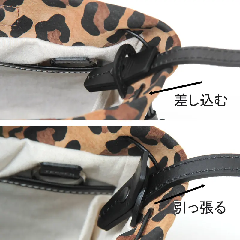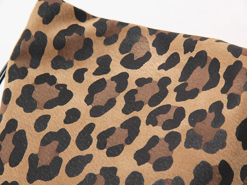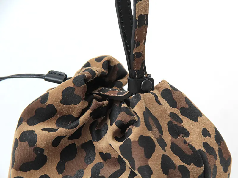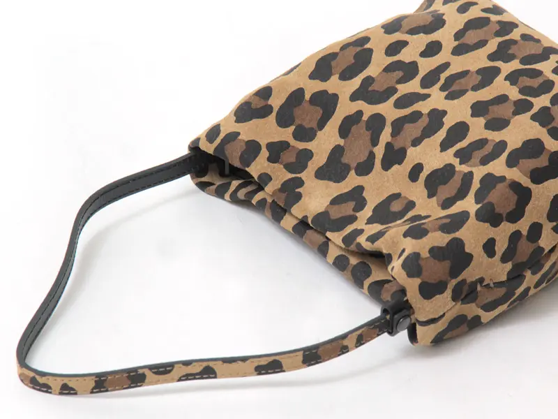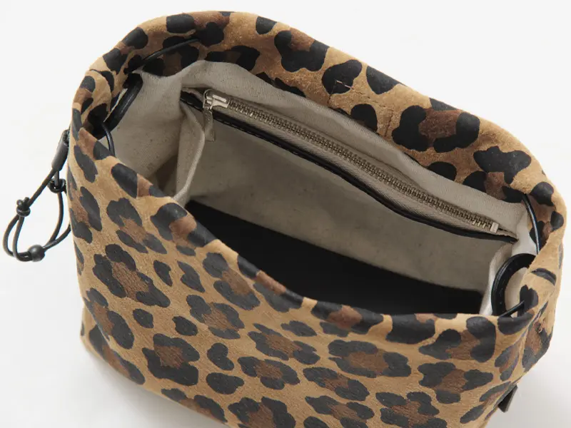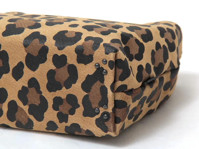 リアルな温かみと上品な肌触りが魅力のピッグスエードを採用。落ち着いたトーンとマットな質感でレオパード柄を表現し、大人の女性が持ちやすい「きれいめ」な印象に仕上げました。光の当たり方で異なる表情を見せる細かい毛羽立ちも魅力。軽さと耐久性があり、使うほどに風合いが増す高級感のある素材です。