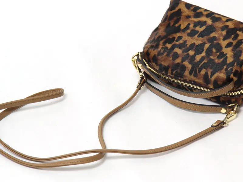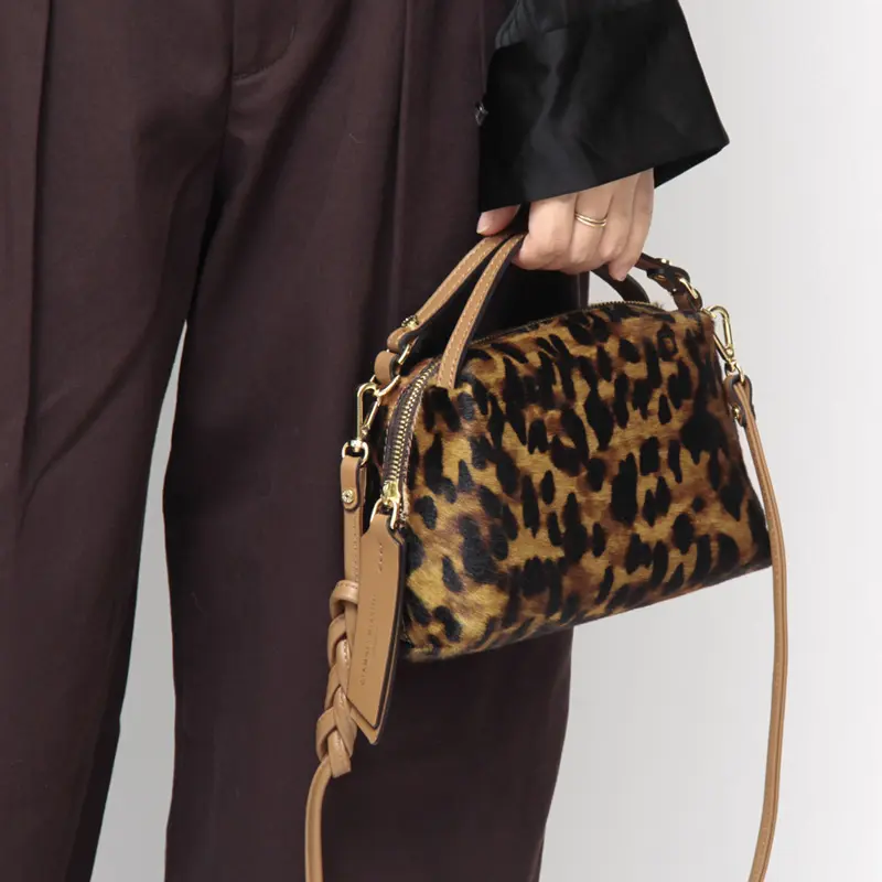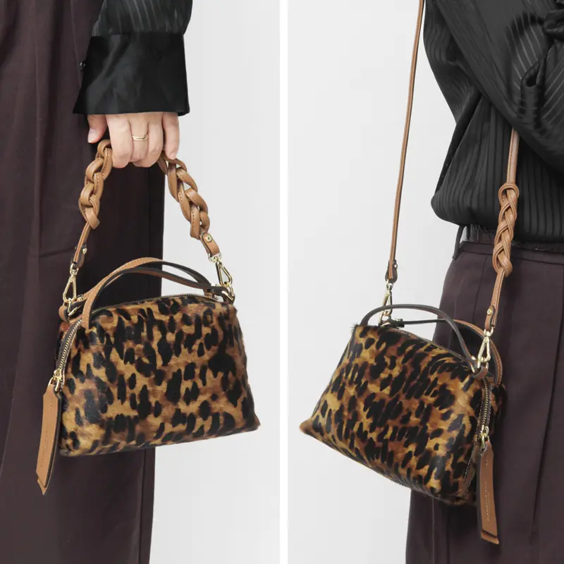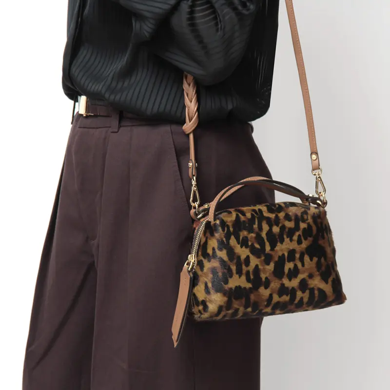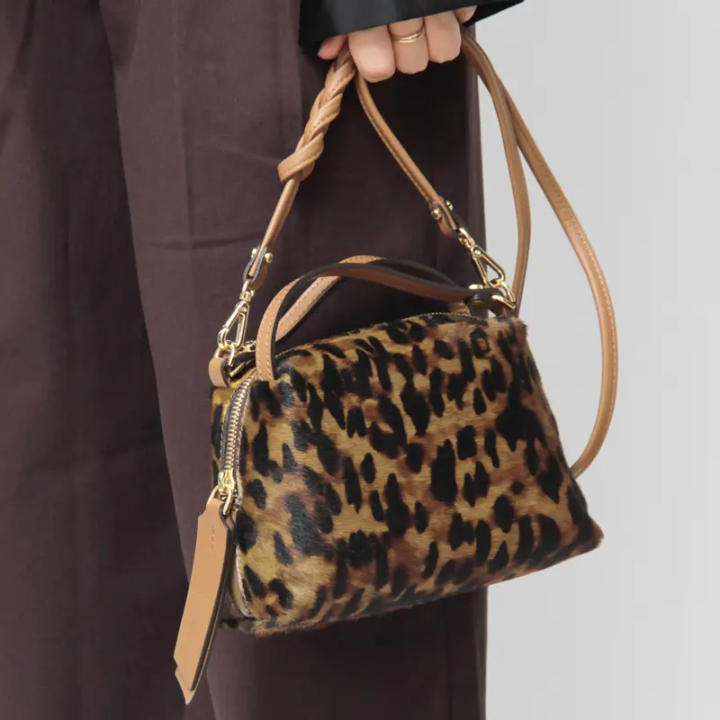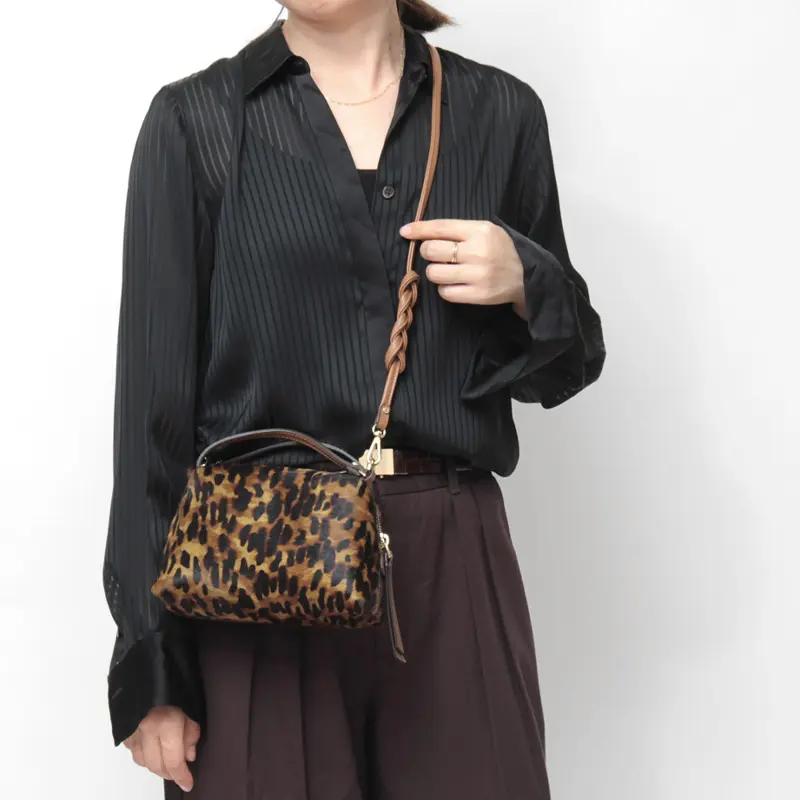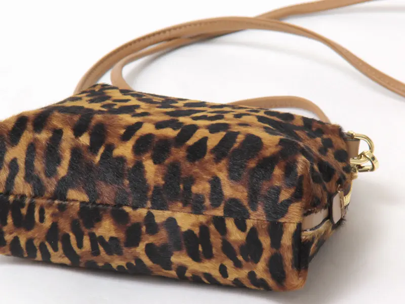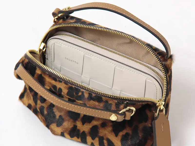 上質なハラコ(ヘアカーフ)にアニマル柄のプリントを施した、個性豊かなバッグ。一つひとつ異なる柄の出方が、唯一無二の個性を演出します。柔らかな毛並みが高級感を醸し出し、持つ人のスタイルに洗練されたアクセントを加えます。普段の装いに、ワンランク上の華やかさと個性を添えるアイテムです。