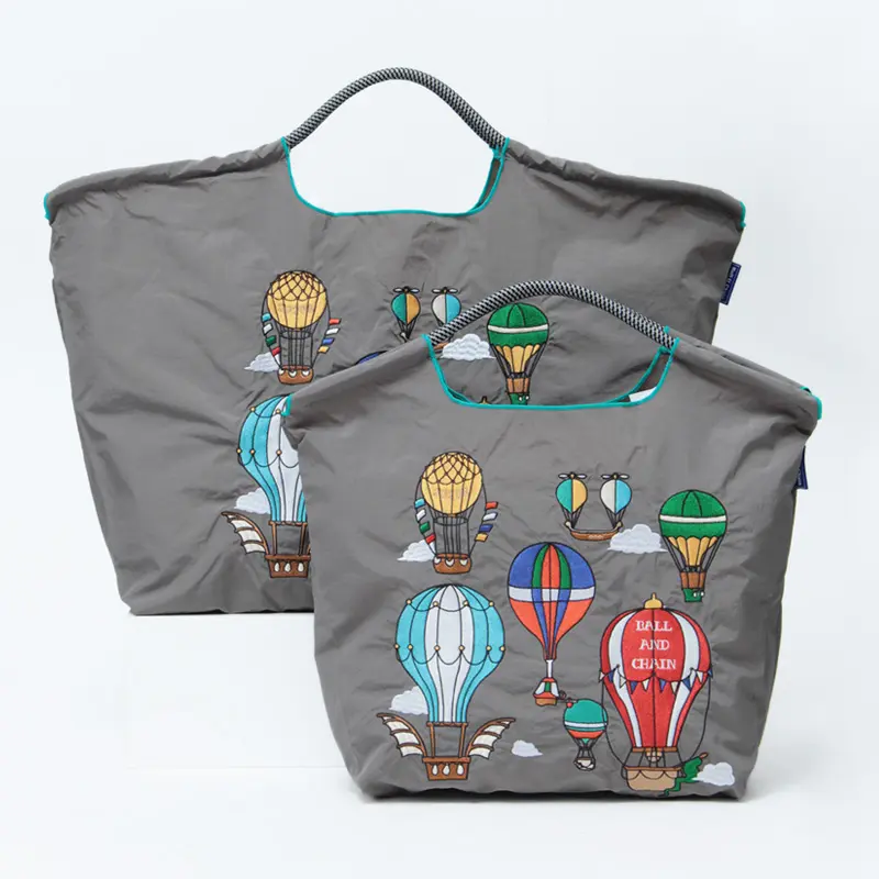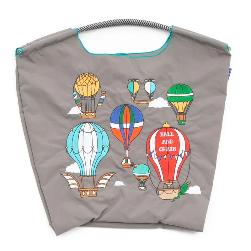 落ち着きのあるグレーのナイロンバッグに、カラフルな気球デザインが映えるエコバッグです。軽量で扱いやすく、普段の買い物やお出かけにぴったり。持つだけでコーデに明るいアクセントをプラスしてくれます。