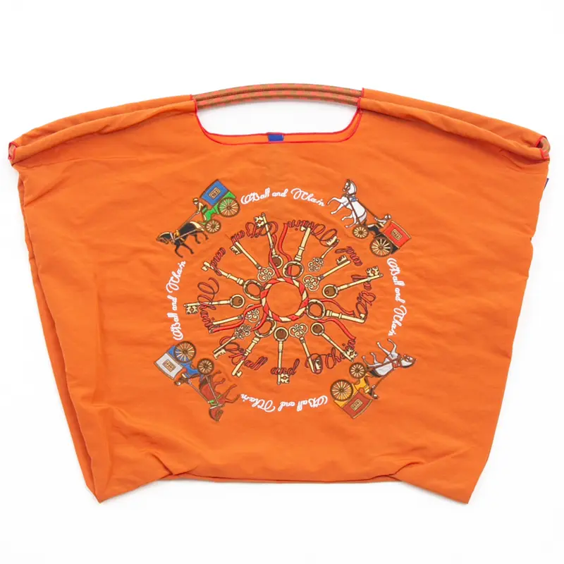 鮮やかなオレンジのナイロンバッグに繊細な刺繍が映え、上品で洗練された大人の女性にも似合うエコバッグに仕上がっています。