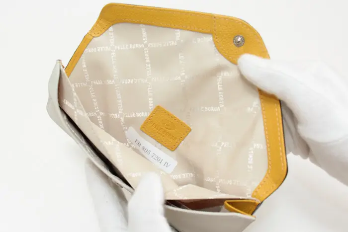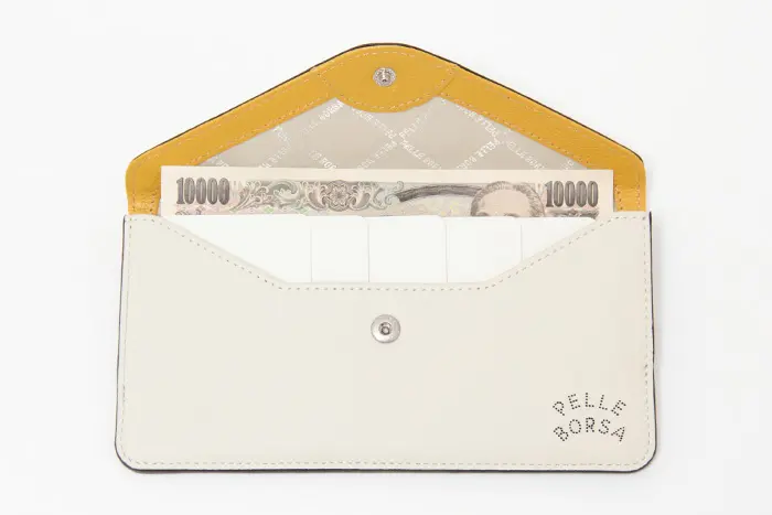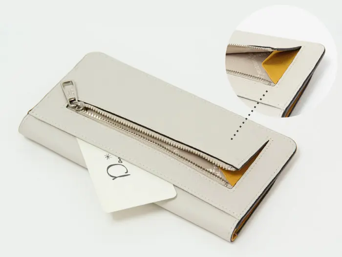 開閉はスナップボタン付きのフラップ仕様です。薄型でありながら、お札・小銭・カードなどをきちんと仕分けて収納できます。