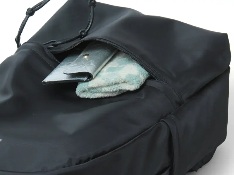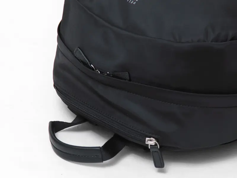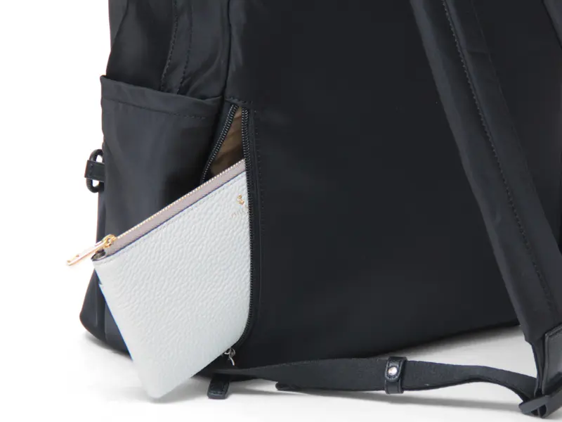 背面サイドには、長財布やパスポートなど貴重品を安心して収納できる独立ファスナーポケット、もう一方のサイドには、本体内部へ直接アクセスできるファスナーを配置。リュックを下ろさずに荷物の出し入れができて便利です。
