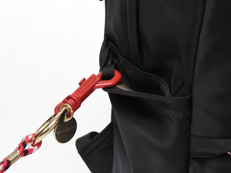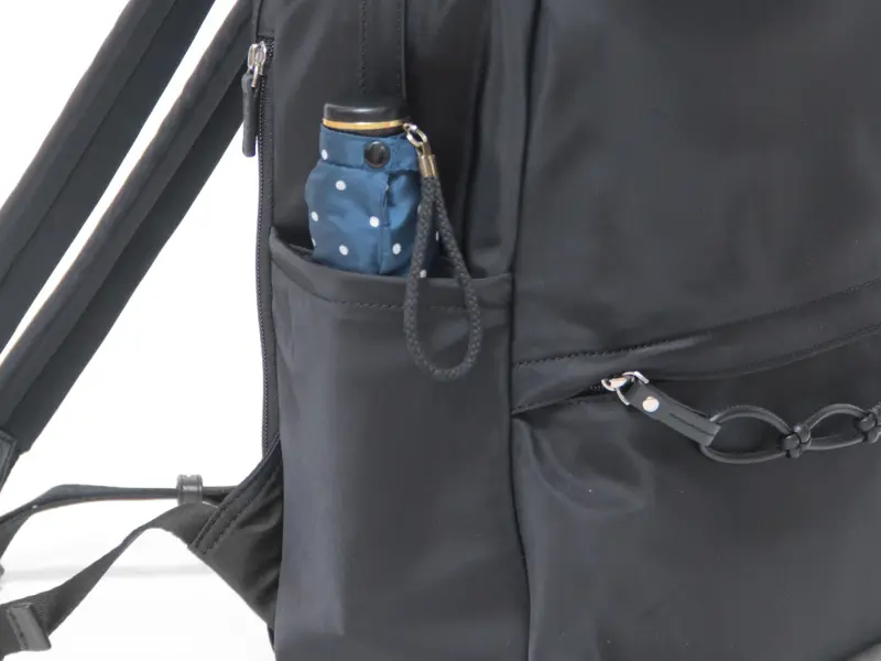 両サイドのポケットには、折りたたみ傘やペットボトルをすっきり収納できます。左側のポケット内にはループが付いており、パスケースや鍵を取り付けられて便利です。