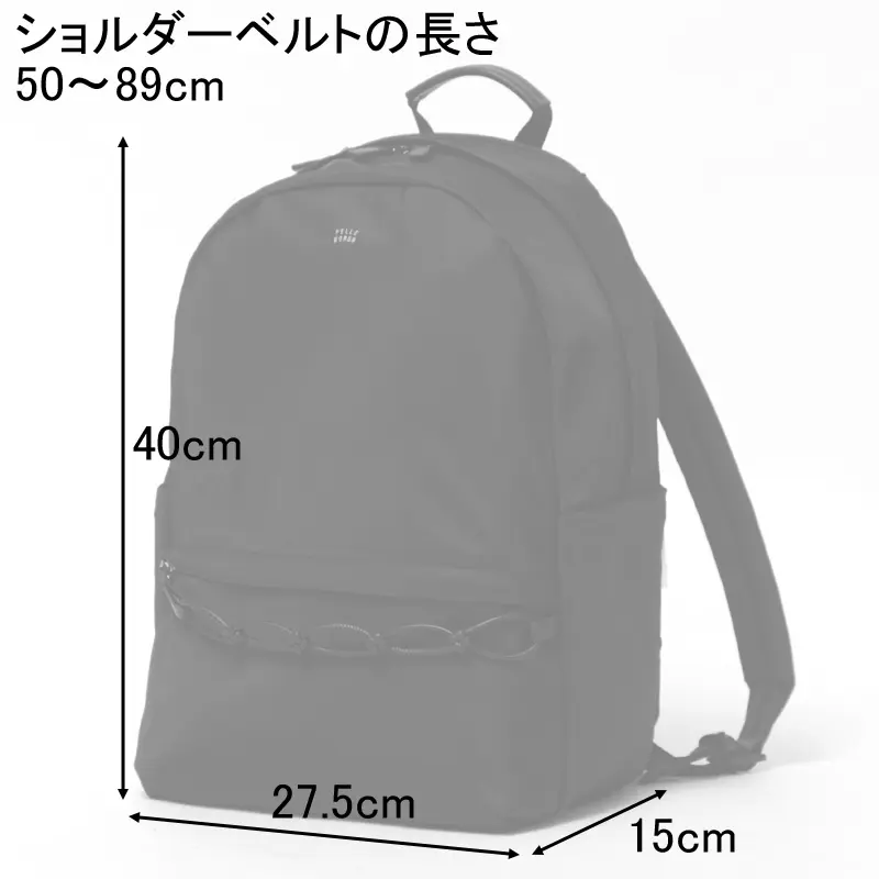 大きく開くファスナー仕様で荷物の出し入れがスムーズ。A4サイズがきれいに収まり、背面にはタブレットや小さめのPCを収納できるウレタン入りのクッションポケットを装備。2つのボトルホルダーでペットボトルや折りたたみ傘も安定して収納できます。マチは15cmあり、羽織り物やお弁当も余裕で入るサイズ感です。前胴には、中身が見やすいメッシュファスナーポケットがあり、迷子になりがちな小物の収納に便利です。