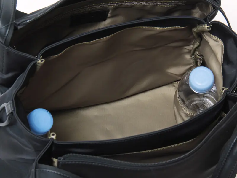 開閉はファスナー仕様で大きく開き、荷物の出し入れがスムーズ。タブレットやPC、A4サイズがきれいに収まり、3室構造でバッグ内の整理も簡単です。2つのボトルホルダー付きで、ペットボトルや折りたたみ傘も安定して収納できます。マチは16cmあり、羽織り物やお弁当も余裕で入るサイズ感です。