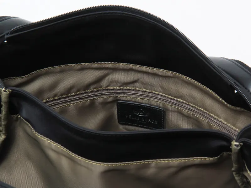 内側の背面には長財布も収納できるファスナーポケット、正面には小物を整理できるオープンポケットが2つ付いています。