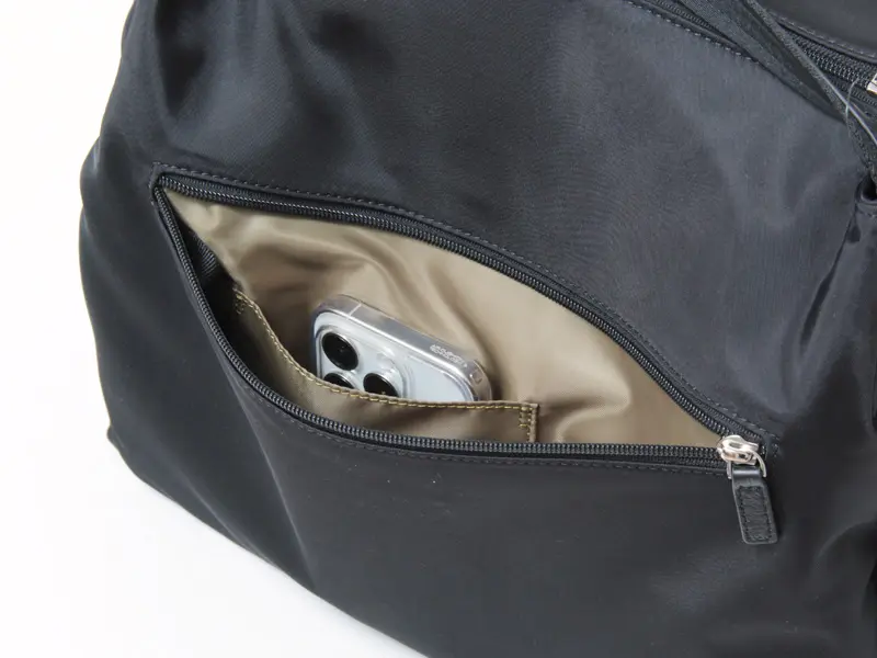 背面にはファスナーポケットが付いており、スマホやICカードなどを収納するのに便利なオープンポケットが備わっています。また、ポケット内にはループが付いており、パスケースや鍵を取り付けられて便利です。