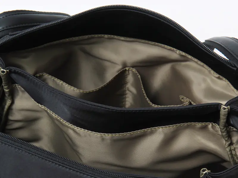 内側の背面には長財布も収納できるファスナーポケット、正面には小物を整理できるオープンポケットが2つ付いています。