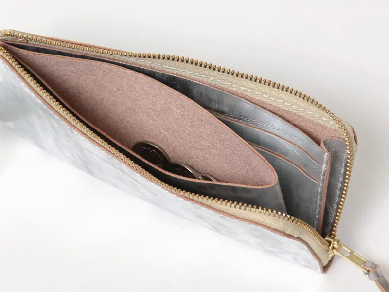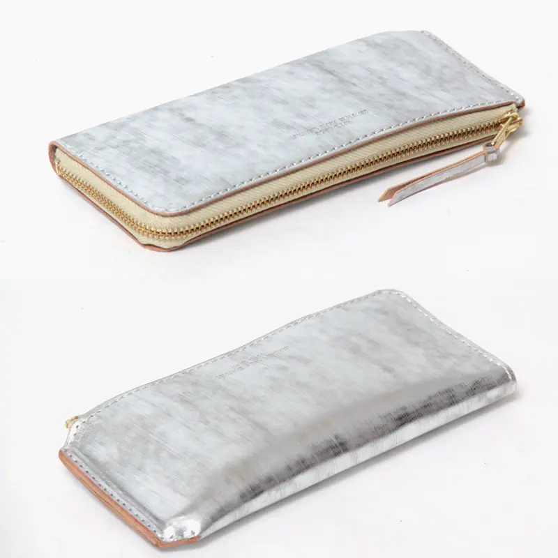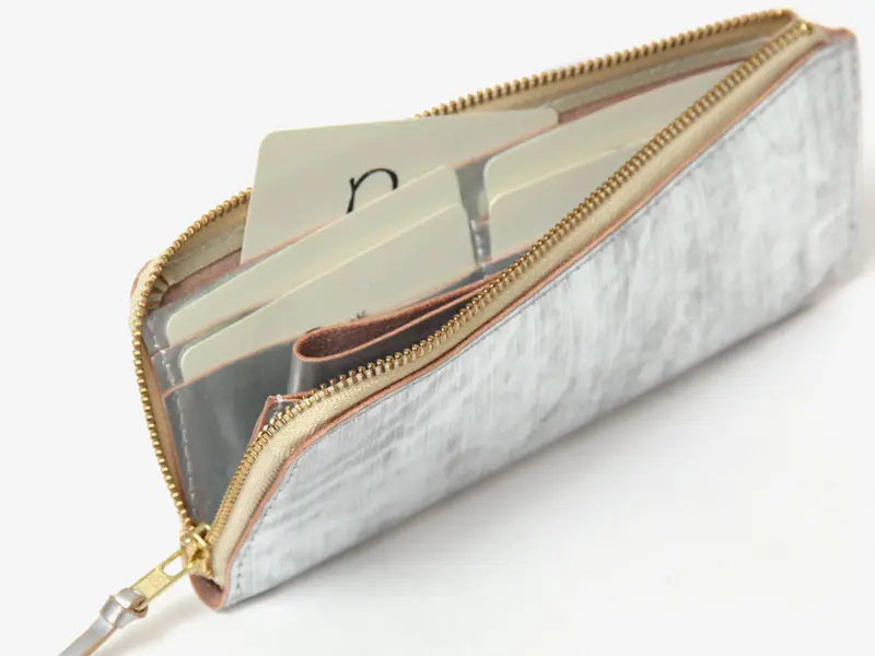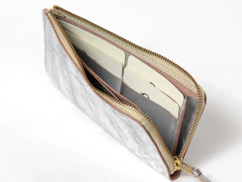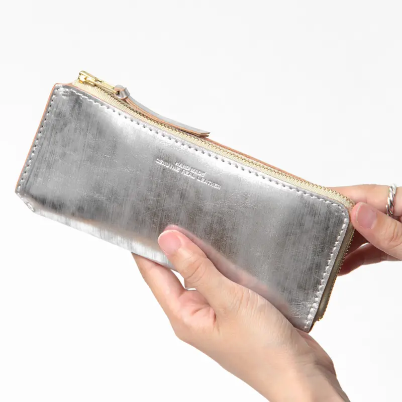 開ける動作まで美しい、L字ファスナータイプ。片側のマチを排したスラント(斜め)な作りと無駄のないシンプルなフォルムが、持つ人に洗練された印象を与えます。極限までスリムに仕上げているため、小さなバッグの中でもかさばらず、いつでもスマートに持ち運べます。