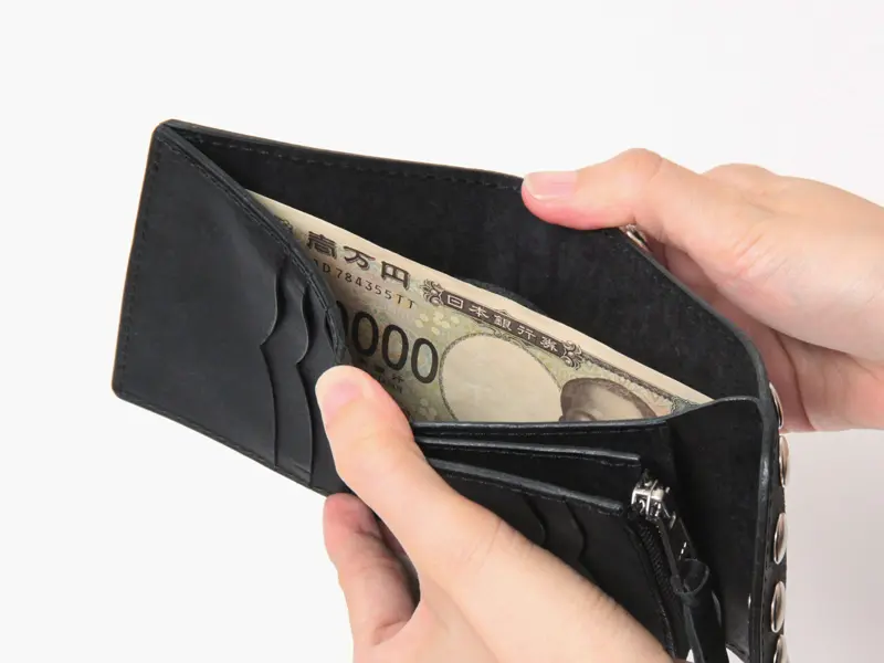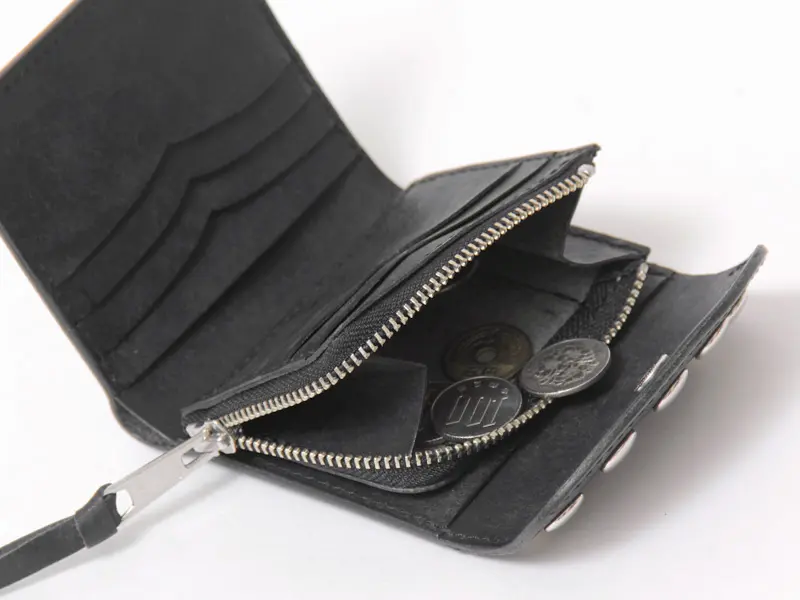 小銭入れはL字ファスナー開閉で、両サイドのマチにより中身が見やすくスムーズに出し入れ可能。カシメの雰囲気に合わせた大きめスライダーもクールなポイント。札入れはサイドポケット仕様で、一万円札もゆったりと収まります。