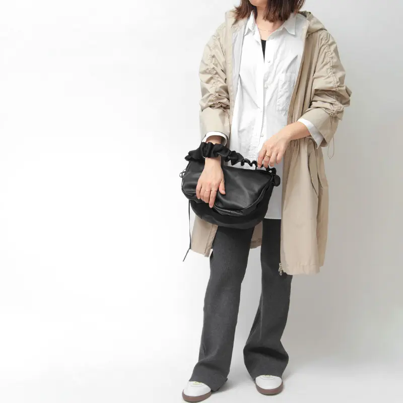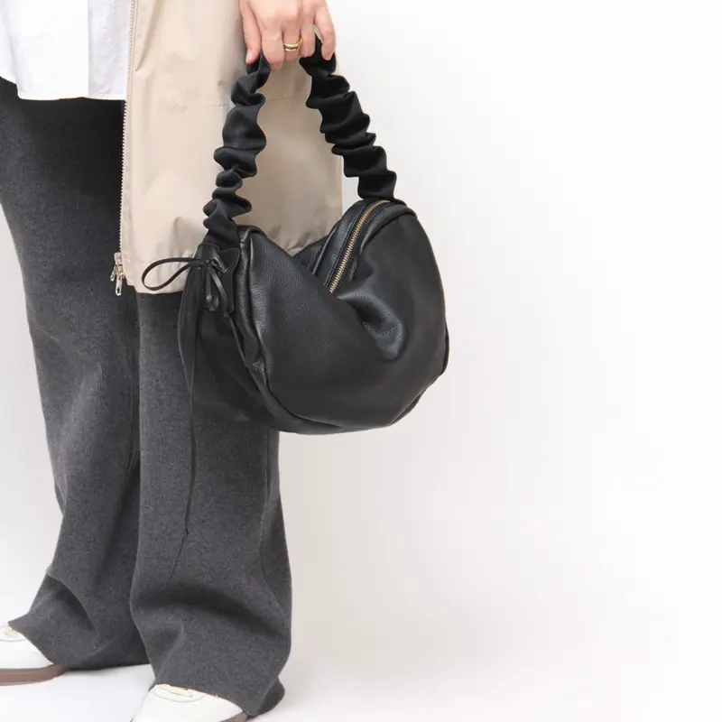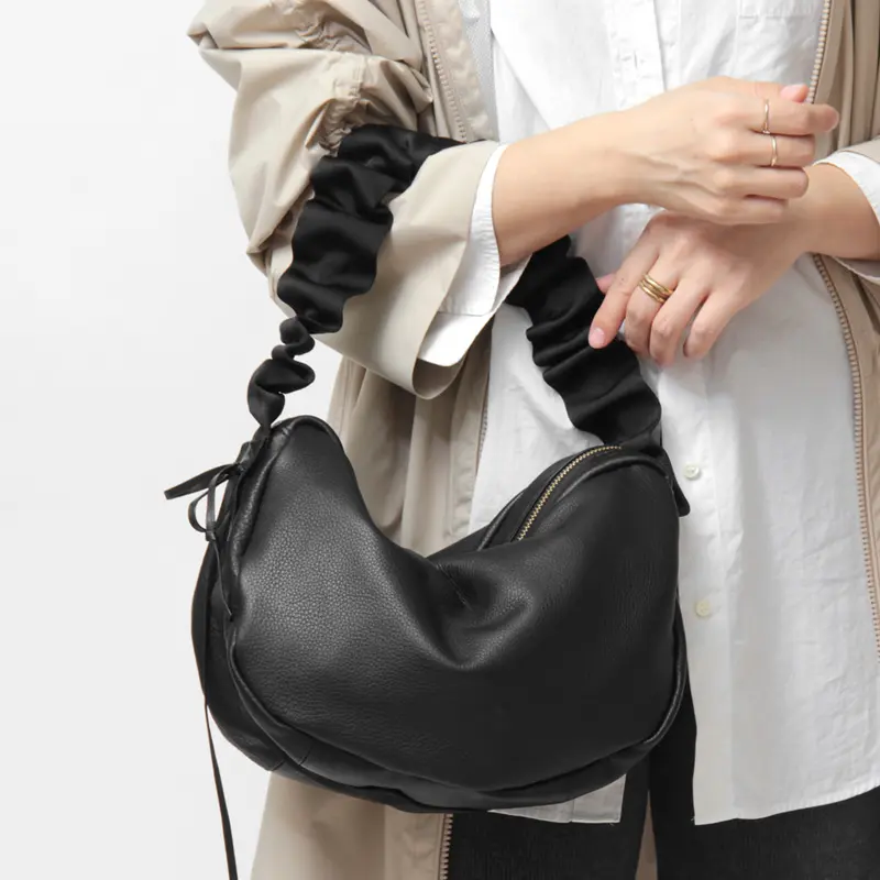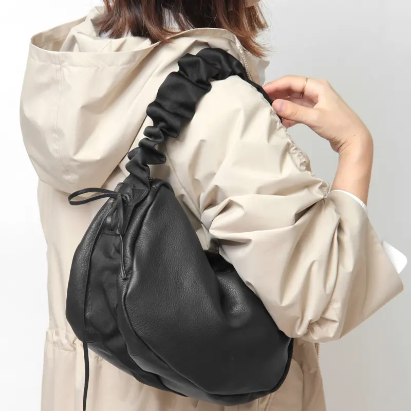 素材の風合いを活かしたミニマルでエッジの効いたデザインが魅力の日本のバッグブランド、POMTATA(ポンタタ)。上質なシボレザーにトレンドのシャーリングハンドルを組み合わせた2WAYバッグ。持つだけで大人のカジュアルスタイルを格上げし、洗練された印象に。必需品をスマートに収納し、デイリーユースから特別な日まで活躍する逸品です。