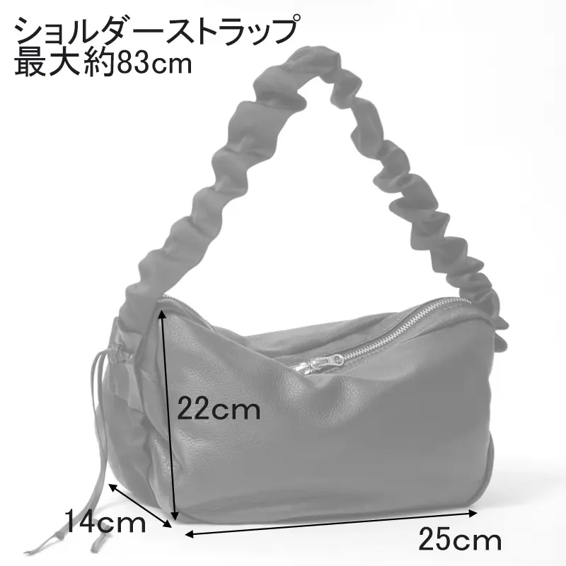 サイドのコードを引くことでシャーリングが生まれ、華やかな表情に変化します。コードを緩めれば、ボディに沿うシンプルなショルダーバッグとして肩掛けスタイルも楽しめます。