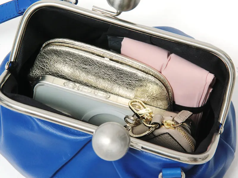 開閉はパチンとしっかり留まる口金仕様で、防犯対策としても頼れる設計です。ミニ財布やスマホなど、お出かけの必需品がコンパクトに収納できます。 内側にはオープンポケット1つがあり、鍵などの小物を収納できます。