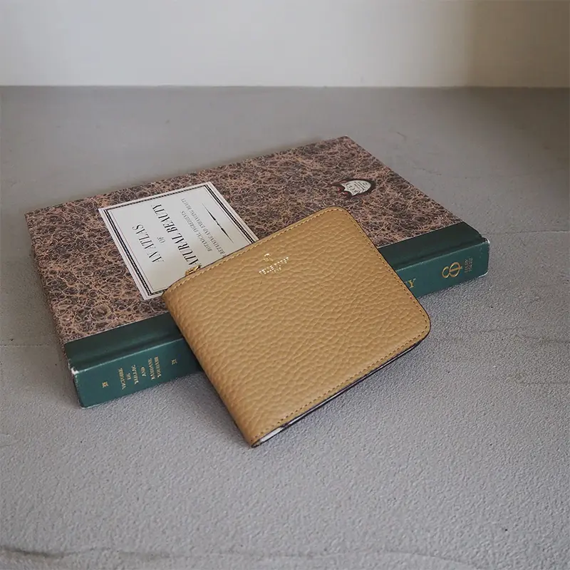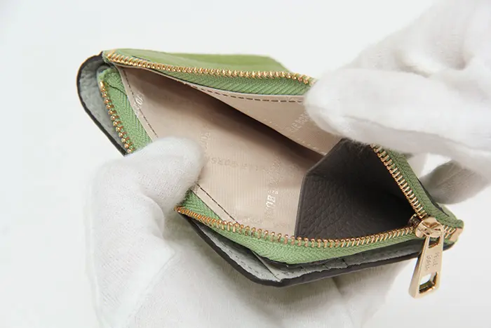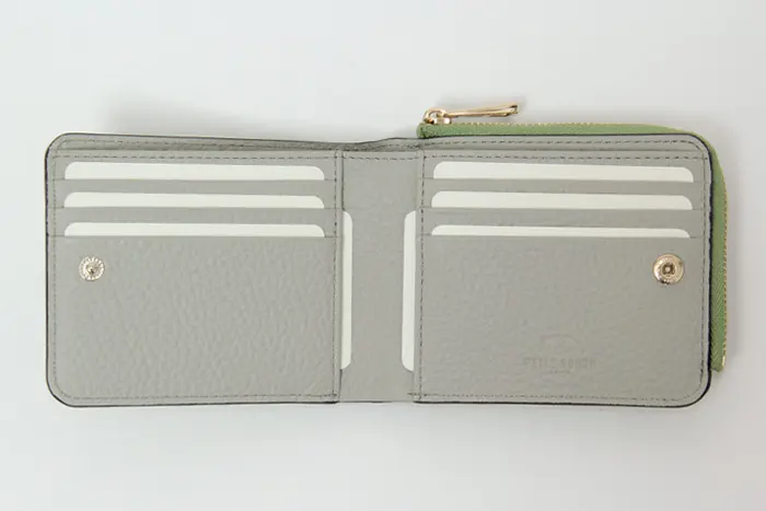 小銭入れは1ヵ所。お財布の外側にあるので、2つ折りのままお使いいただけます。L字ファスナーとササマチでしっかり開き、あげ底なので小銭が見えやすく取り出しやすいデザインになっています。