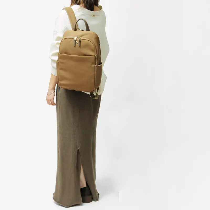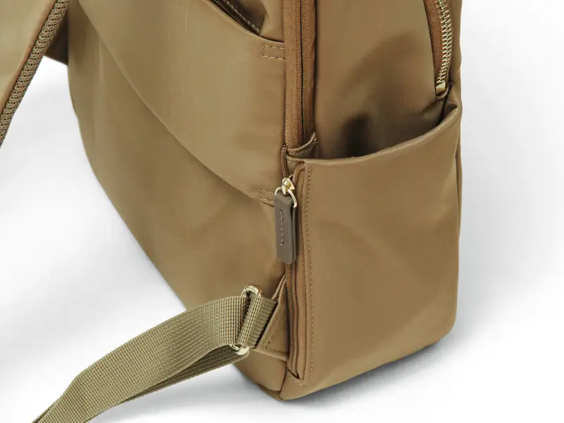 軽量で撥水性に優れたナイロン素材を使用。光沢を抑えたマットな質感が特徴で、上品で落ち着いた印象を演出します。しなやかさと適度なハリを兼ね備え、型崩れしにくく美しいフォルムをキープ。部分的にあしらわれたレザーが上質感をプラスし、デイリーユースにもふさわしい洗練された仕上がりです。