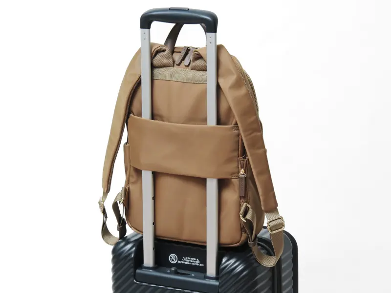 スーツケースに差し込むキャリーオン対応の背面ベルトが備わっています。キャリーケースに乗せて移動ができ、移動中の負担を軽減してくれます。
