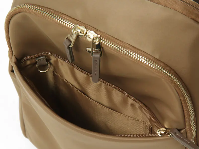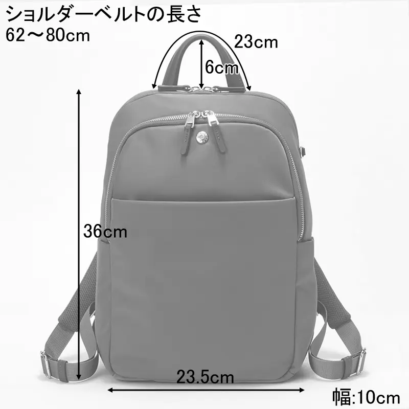 2層構造の本体は、大きく開くダブルファスナー仕様で開閉がスムーズ。背面にはPC・タブレット専用の薄マチポケットを備え、小物整理に便利な多彩なポケットも充実しています。メイン収納はマチが10cmあり、ペットボトルや折りたたみ傘も余裕で入るサイズ感です。オープンポケットやファスナーポケットが備わっており、ハンカチや鍵など小物も整理しやすくスッキリ収納できます。