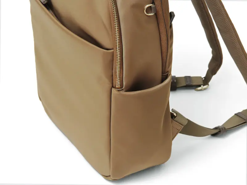 両サイドにオープンポケットを備え、メイン収納を開けずに頻繁に使うアイテムをすぐに取り出せます。片側のポケットはファスナーでマチを広げられる設計で、ペットボトルなどの収納にも便利です。
