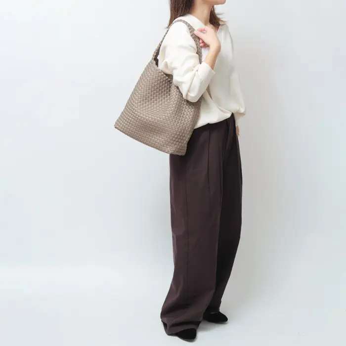 肉厚でハリのあるもっちりとした質感のハンドルは継ぎ目なく編まれ、職人の技が光る高級感のある仕上がりです。幅広で平らなハンドルは肩に快適にフィットし、肩への負担も軽減してくれます。