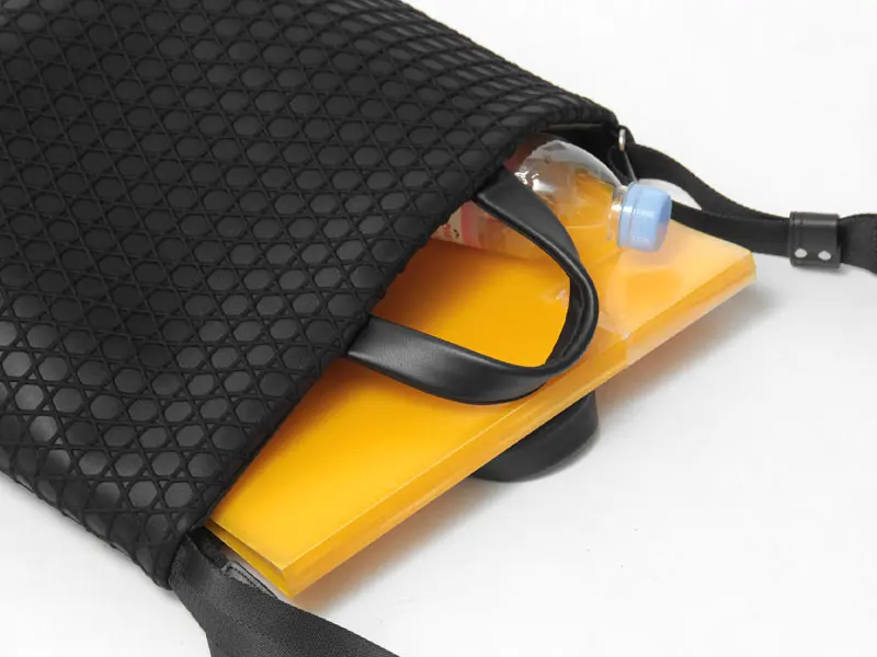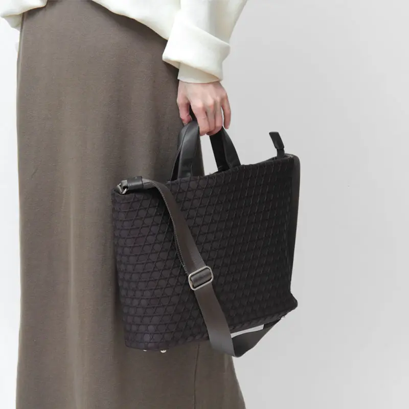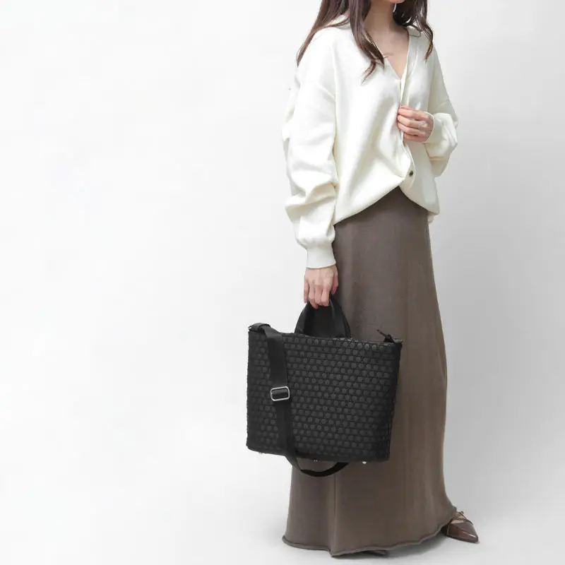 KAGOME PATTERN EMBOSS BONDING SLIM TOTE【031691】 肉厚なウレタン生地に篭目文様をエンボス(型押し)した"篭目エンボスボンディング"シリーズ。篭目柄は規則的なパターンが織りなす絶え間ない連続性から、繁栄や安定、絆、繋がりを象徴しています。凹凸の表情豊かな風合いがナチュラルで、美しく上品な佇まいです。