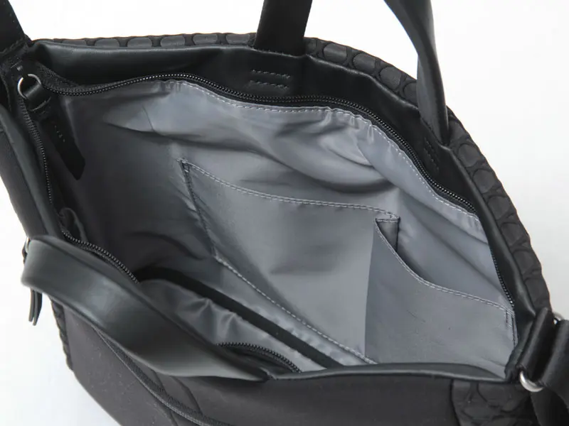 内装には、マチのある立体的なオープンポケットや、ファスナーポケットを装備。さらに、保護用の圧縮ウレタンを採用した専用ポケットは、B5サイズのタブレットや小型ノートPCの収納に最適です。バッグの中で大切な機器同士がぶつからないよう、細部にまでこだわって設計されています。