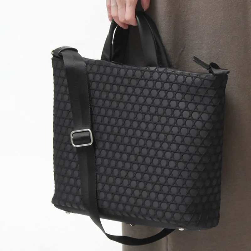 日本の伝統美がモダンに息づく京都発ブランド"LAQUOH (ラクーオ)"の「篭目エンボスボンディング」シリーズ。軽くて丈夫な素材に施した上品な籠目柄エンボスが際立つスリムな2WAYトートバッグは、13インチノートPCがすっきり収まる絶妙なスリム設計。さらに、大切なPCや荷物を守る、クッション性と撥水性を兼備しています。街歩きから毎日の通勤バッグまで幅広く活躍する、実用性の高い逸品です。