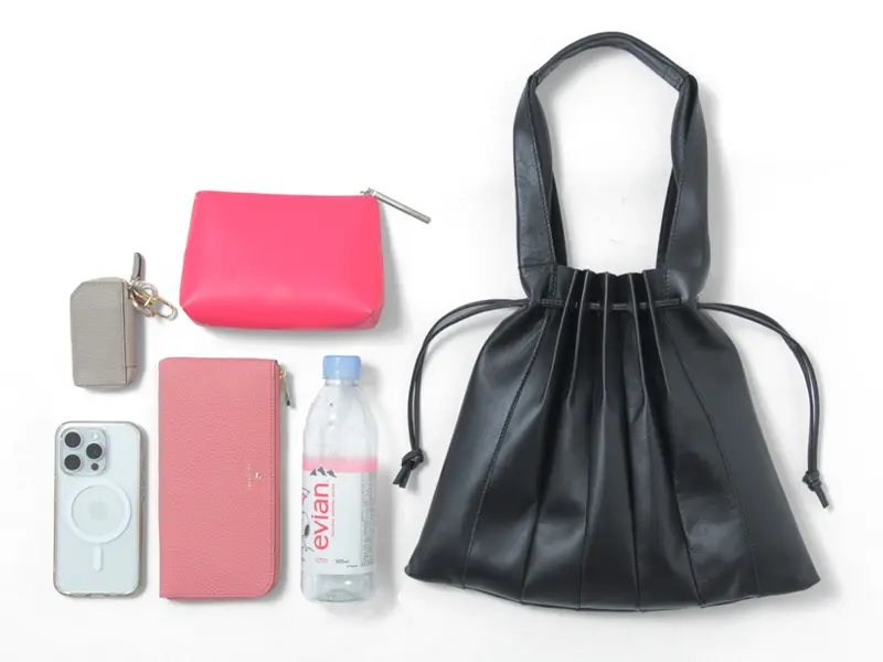 開閉は巾着仕様。長財布やポーチなどお出掛けの必需品はもちろん、500mlペットボトルも収まります。